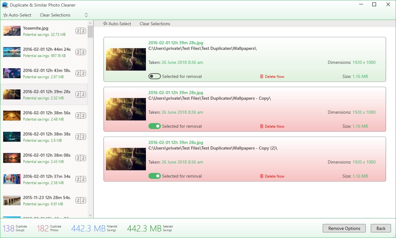 To make it easy, auto-select, selects the most obvious duplicates for you, using a rules based engine, allowing you to review and edit, or just send the duplicates to the recycle bin, backup folder, or delete them permanently.