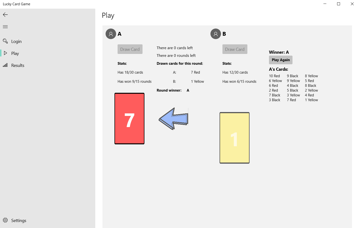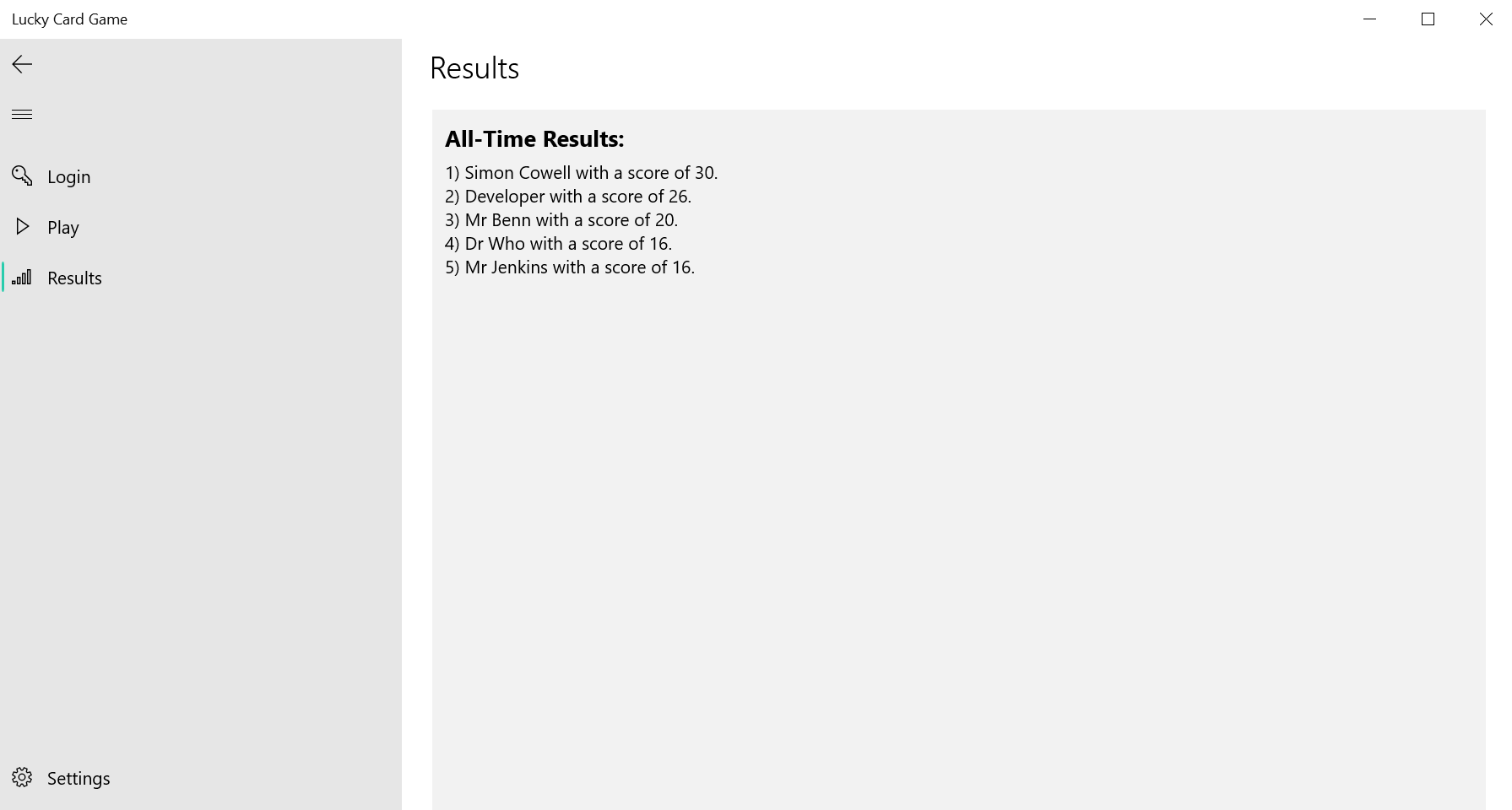 Card-based entertainment that I created for my Computer Science NEA project at GCSE level. Based on luck, and there is an all-time results tab now (local to machine).