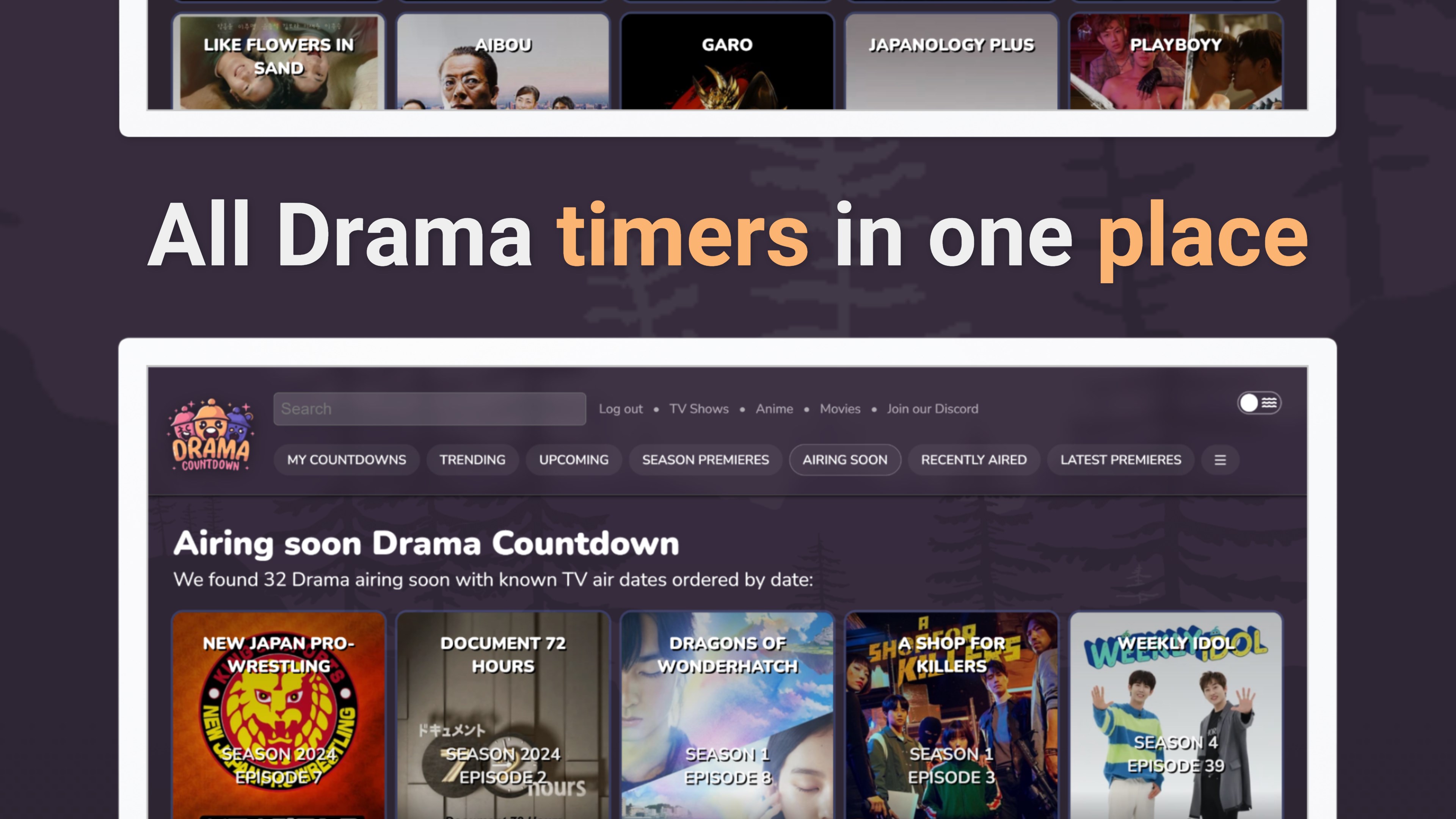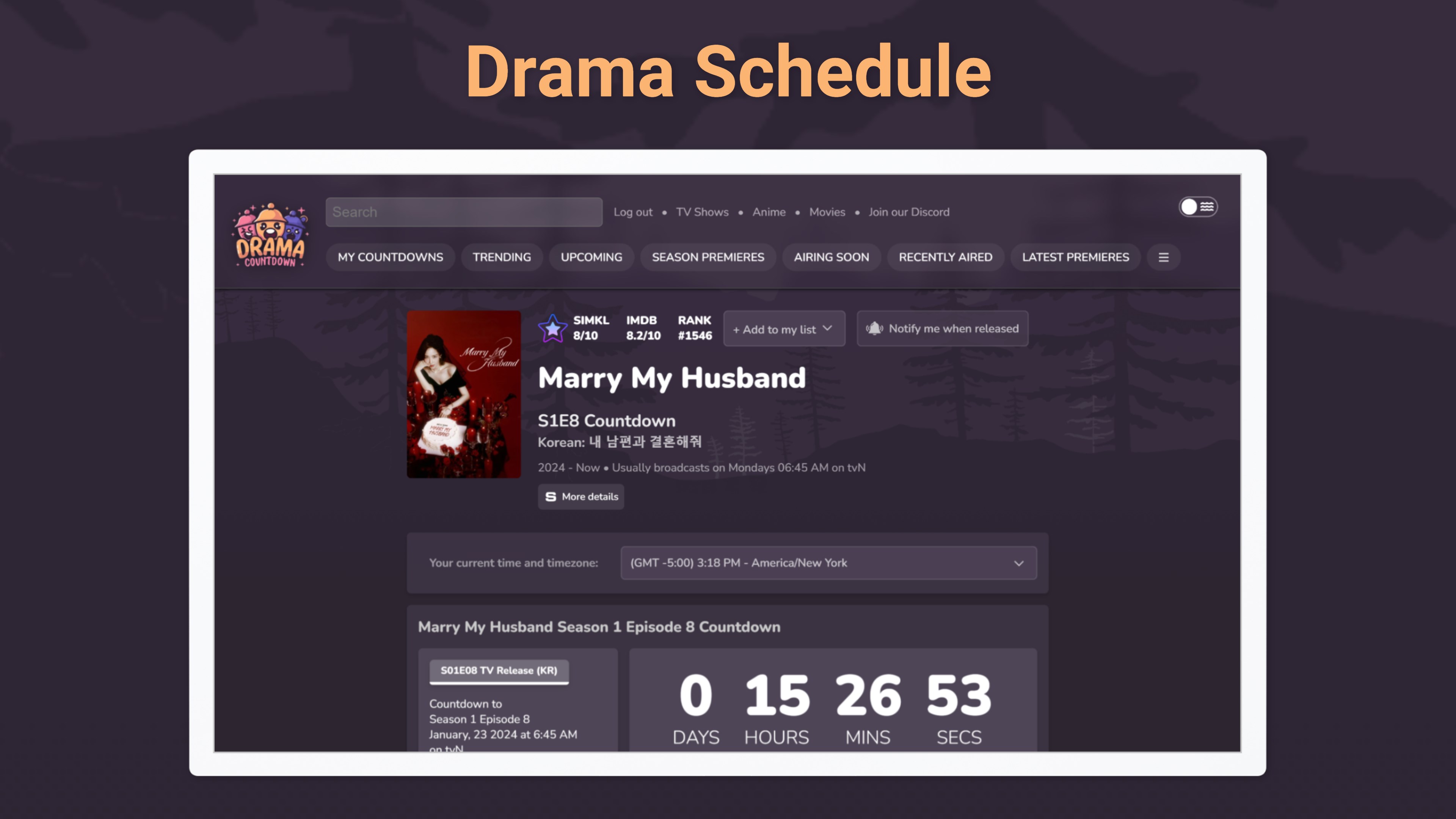 Extensive Drama Library: Countdowns for a wide range of Asian dramas, from the latest K-Dramas to classic J-Dramas and beyond.Precision Countdowns: Accurate episode countdowns ensure you never miss out on your favorite shows.Up-to-the-Minute Updates: Get the latest airing schedules and release dates for all your preferred dramas.User-Centric Interface: An intuitive and friendly design makes navigating our vast drama collection effortless.Real-Time Updates: Continuously updated content from Asian TV networks and streaming platforms.Simkl Watchlist Integration: Timely alerts about new episodes and the latest drama news keep you in the loop.Tailored Experience: Features and updates designed specifically for Asian drama aficionados.Comprehensive Schedules: Detailed schedules and calendars help you plan your drama watching.