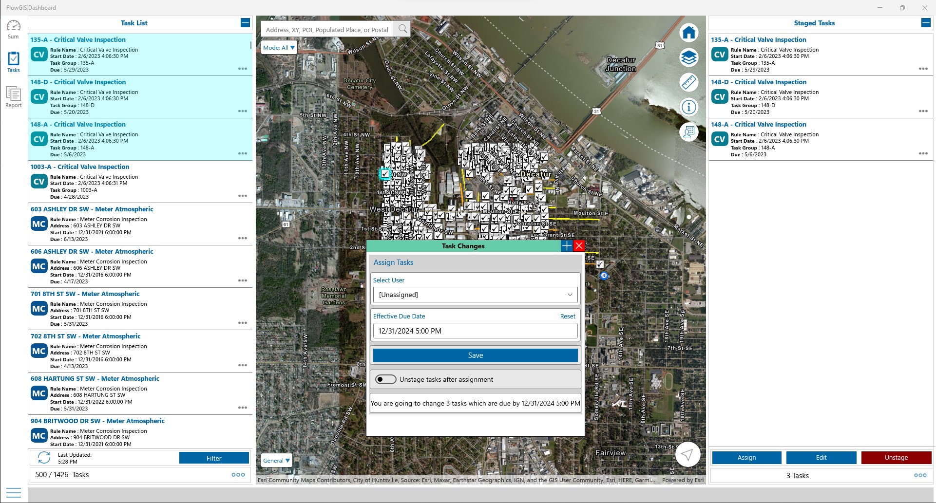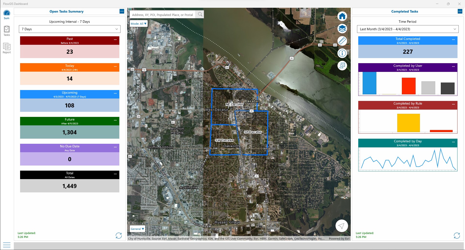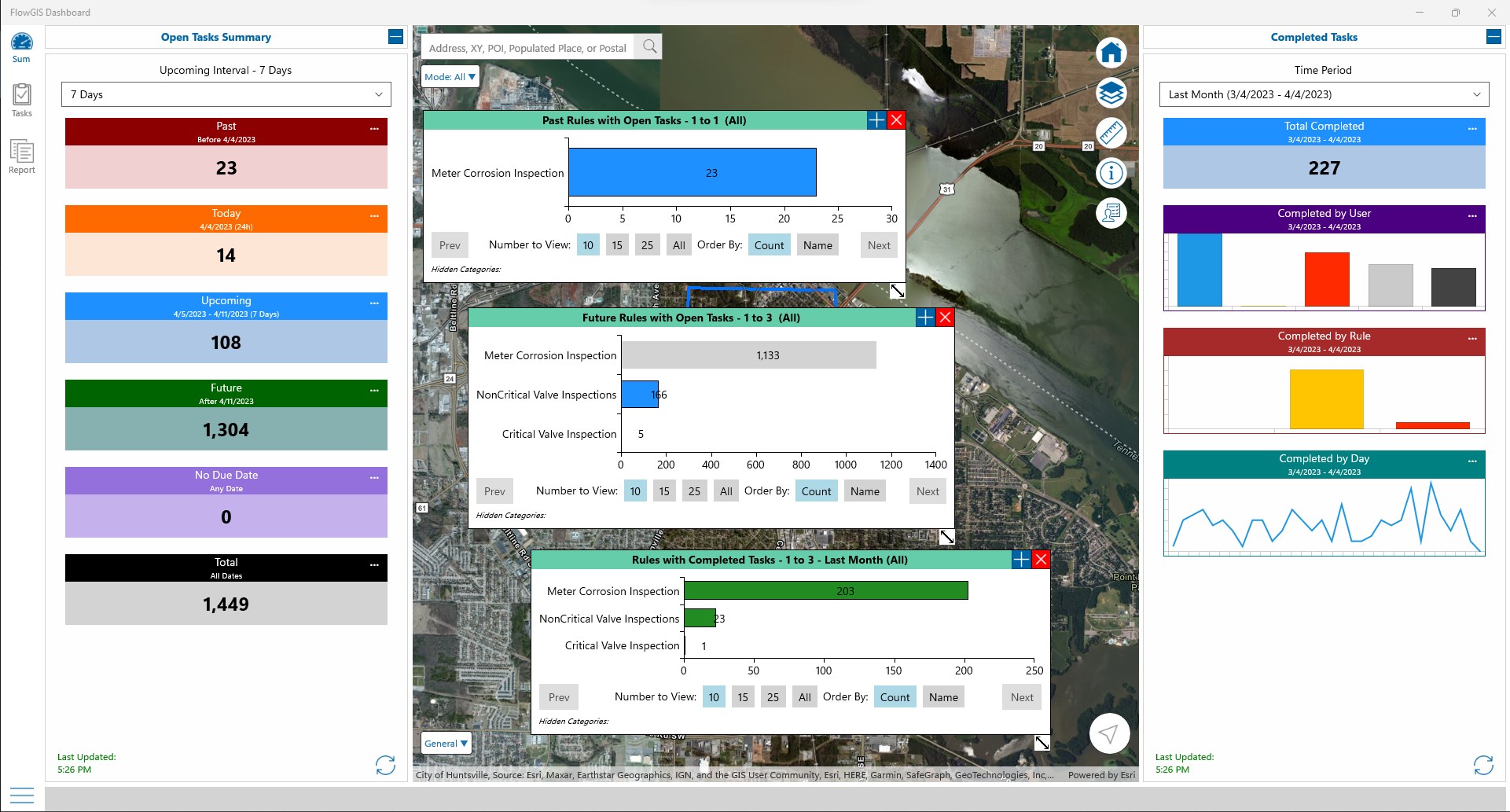 FlowGIS is a B2B GIS-centric solution for helping utility companies meet compliance requirements by providing tools to manage task planning/scheduling, field data collection, and reporting. FlowGIS Dashboard app allows users to manage task assignments, visualize workload, run reports, and monitor work progress in a map-centric environment.