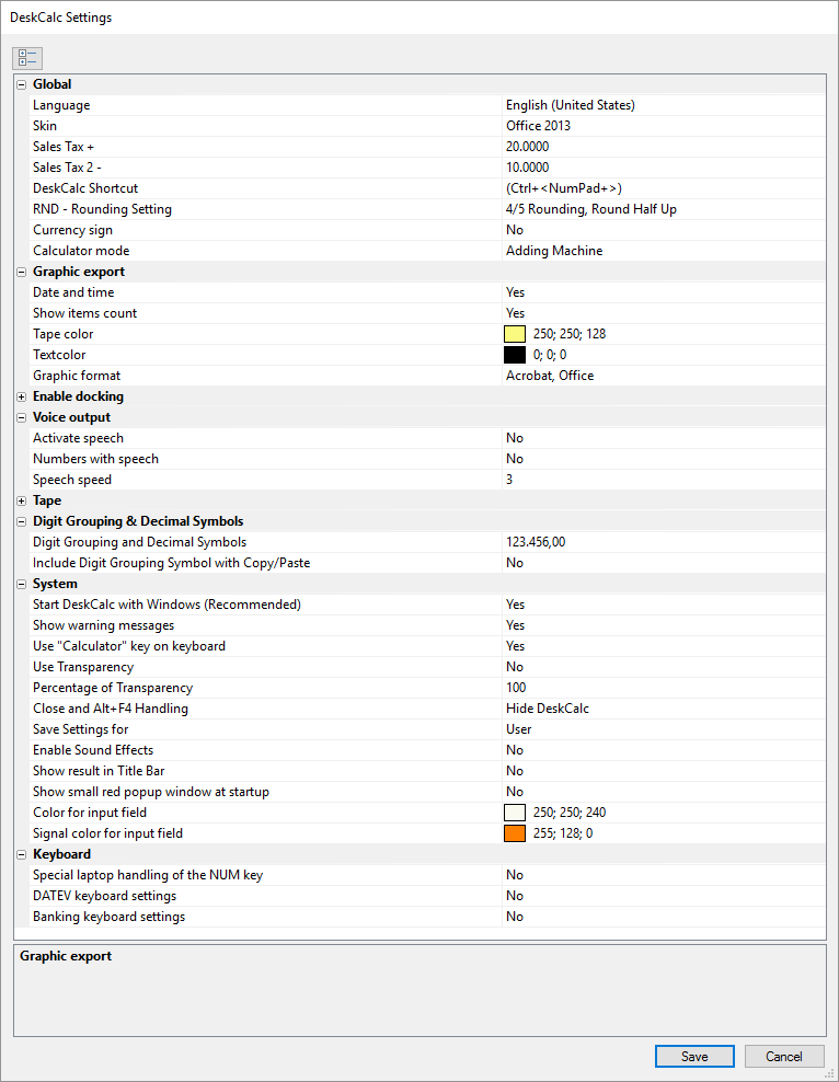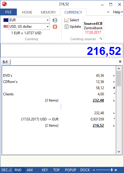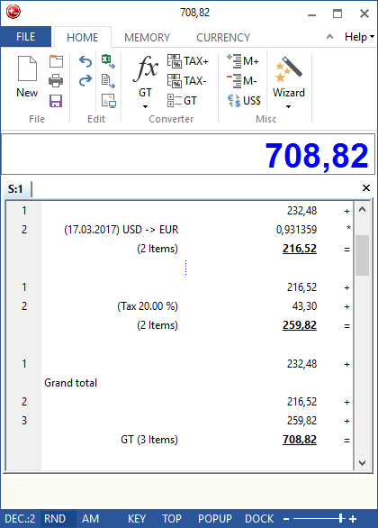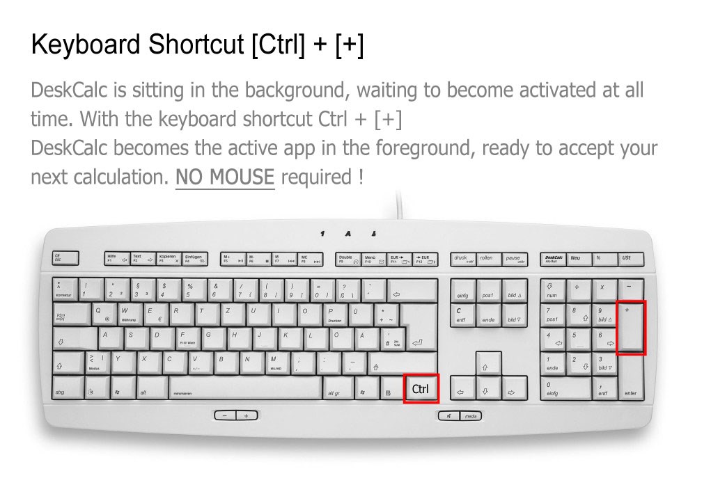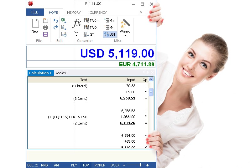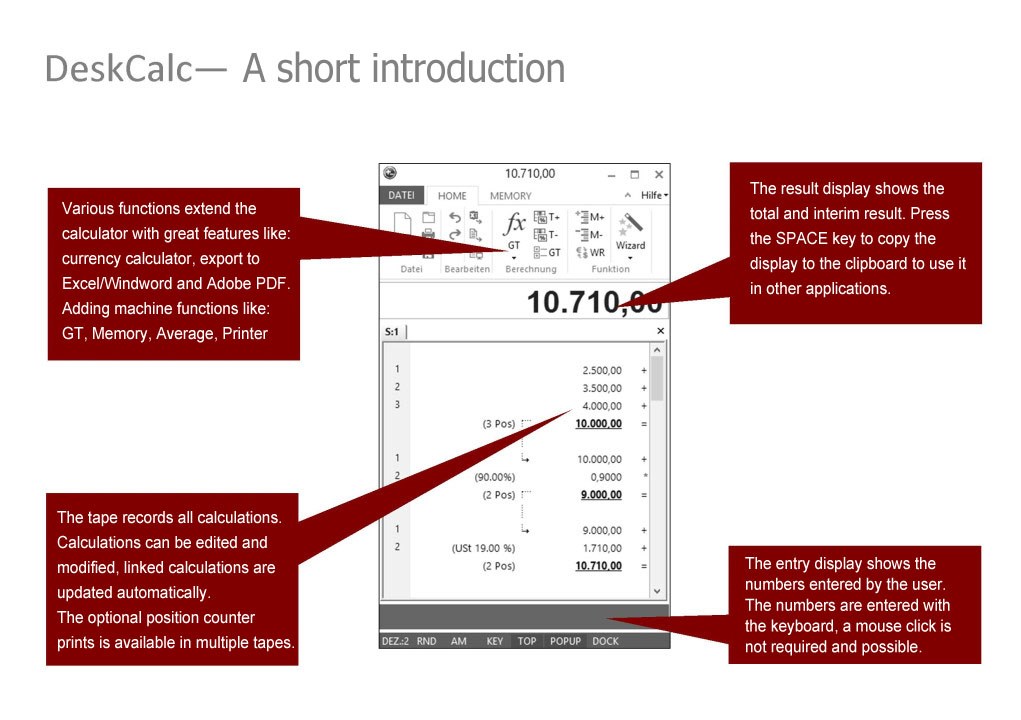 Calculate TAX, VAT and other percent values easilyAdding Machine, Desktop calculator keyboard logicCurrency converter with daily interent updatesEditable tape - Excel lightSave and print the tape with your calculationsExport the tape to Excel, WinwordAnnotate PDF\'s with your calculationsAnnotate your calculations in the tapeTime calculator, Grand total, Average value, AM, RND and many moreSound keystroke, Voice speak - DeskCalc does speak your numbers, operations and results while typingEdit mode allows you to delete, insert, modify individual rows Multiple tapes/calculations at the same timeUndo an unlimited number of times Individual styles, for example Office 2010, 2013Grab numbers from the tape to use in your current calculation and vice versaKeyboard shortcuts, Hotkeys, fast, simple, easy to use