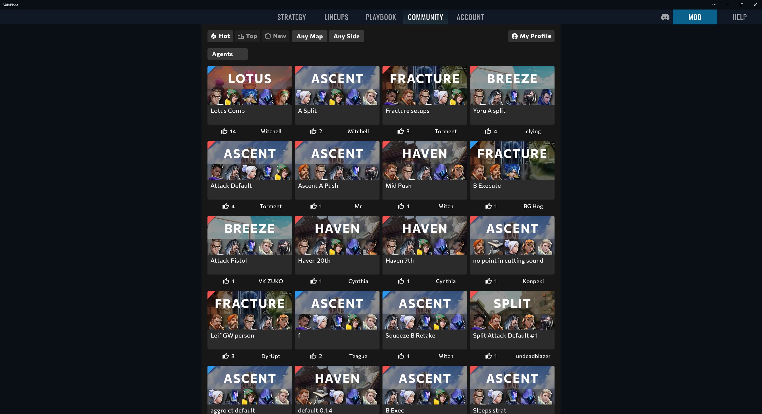 Drag and drop accurately sized agents & abilities onto any Valorant map released so farBrowse the community market with hundreds of existiting, free strategies and lineupsThe drawing and text box tools help you further detail your strategyPro features like the playbook and strategy sequencing help you create and share the strategies of your dreams