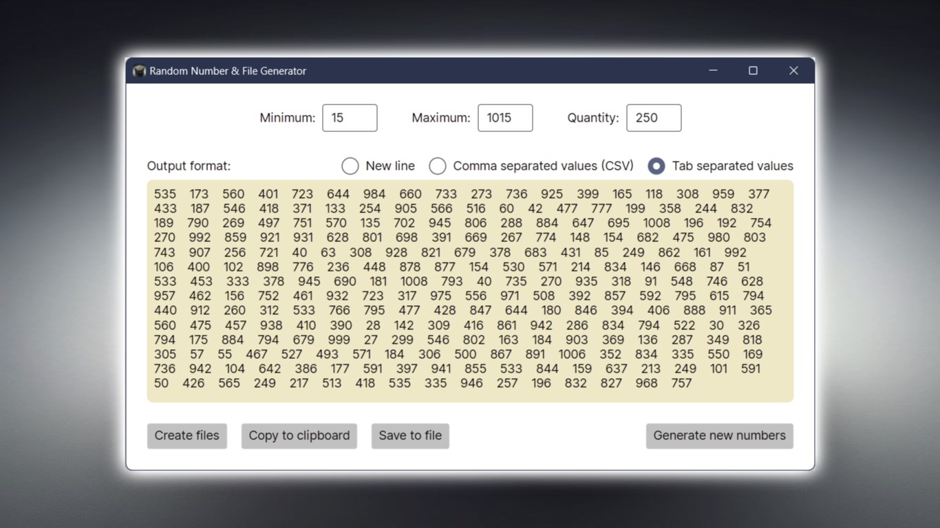 Generates integer numbers between two pointsGenerates a specific number of random numbersCreates files based on the random numbersSupports Newline, CSV, and TSV formats