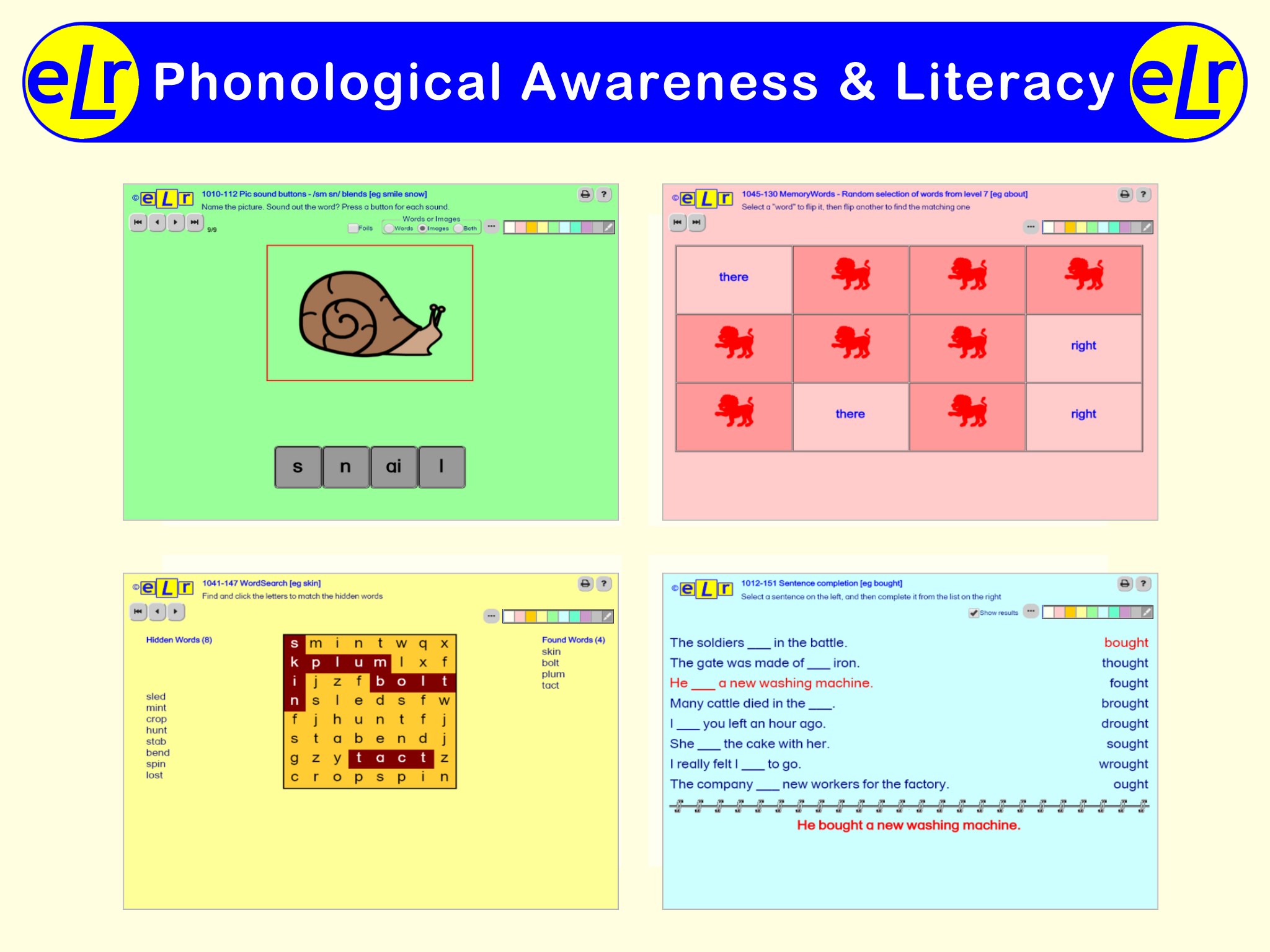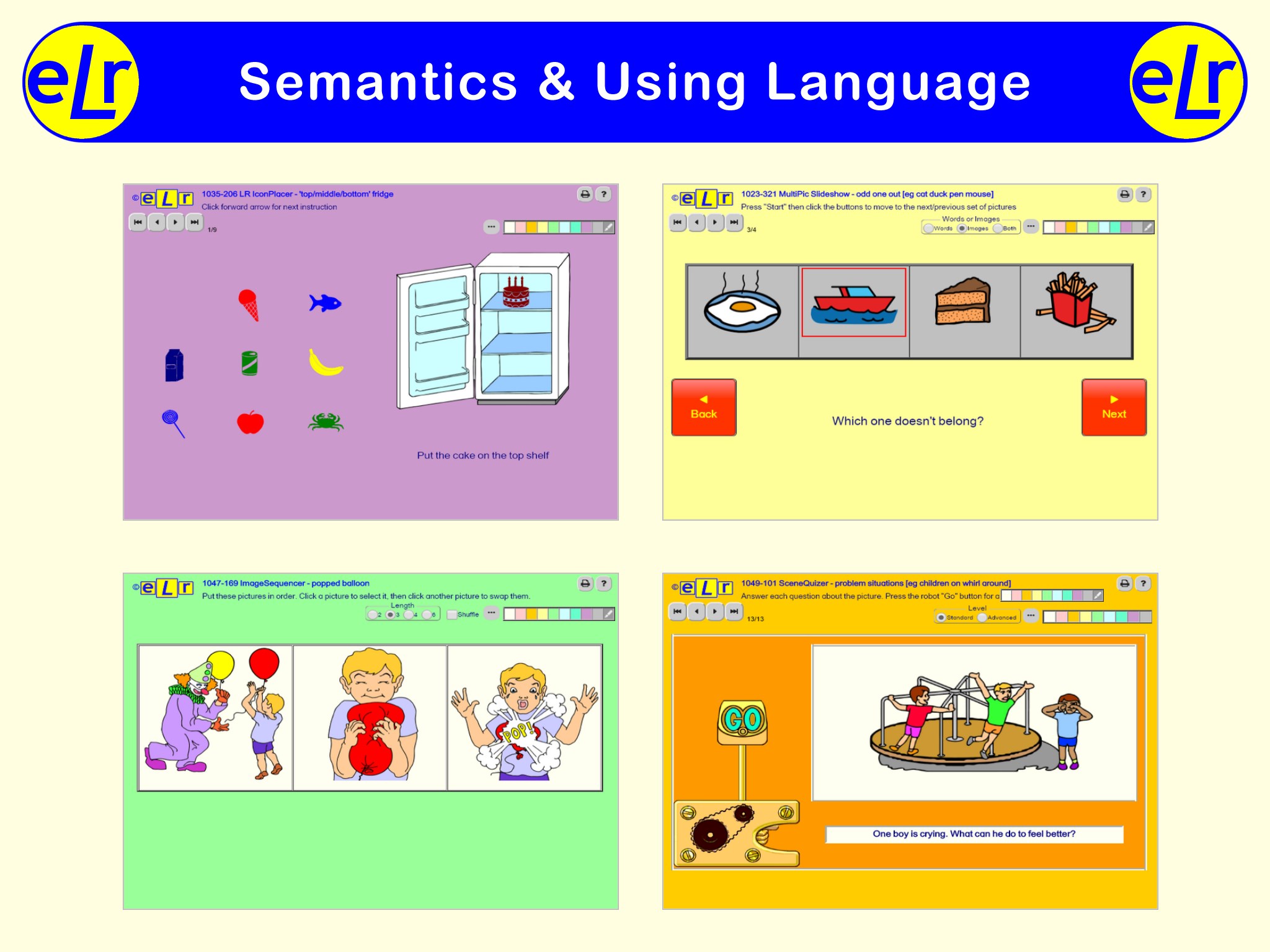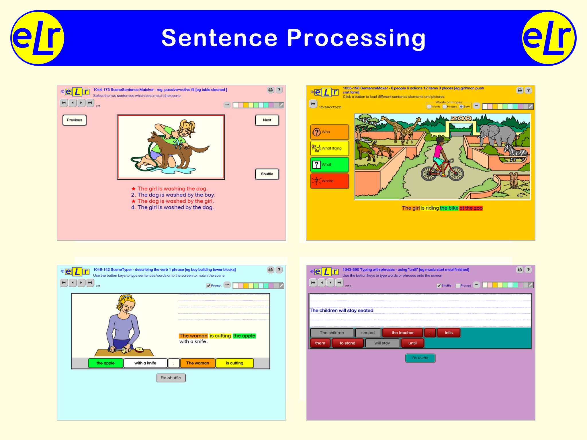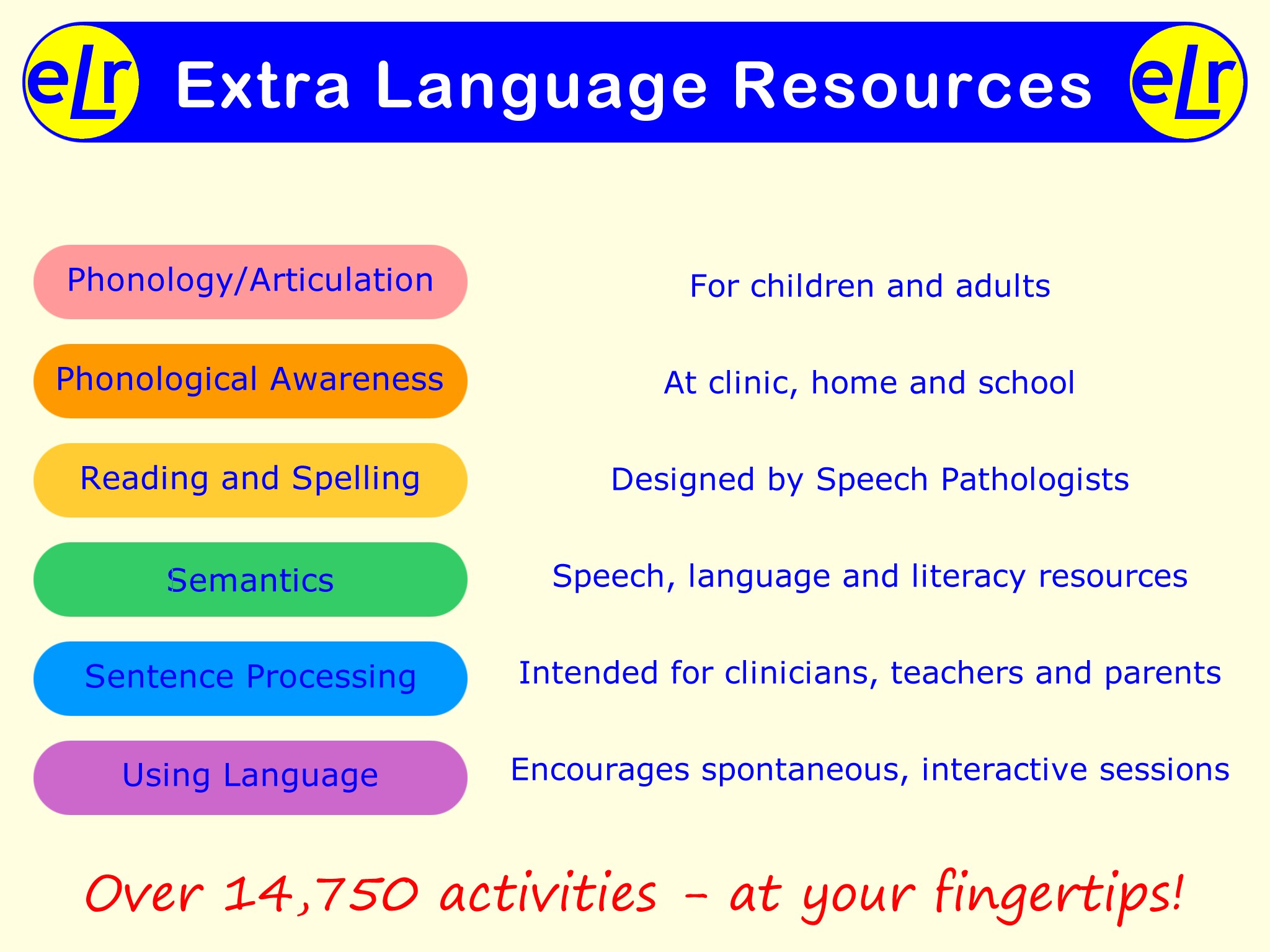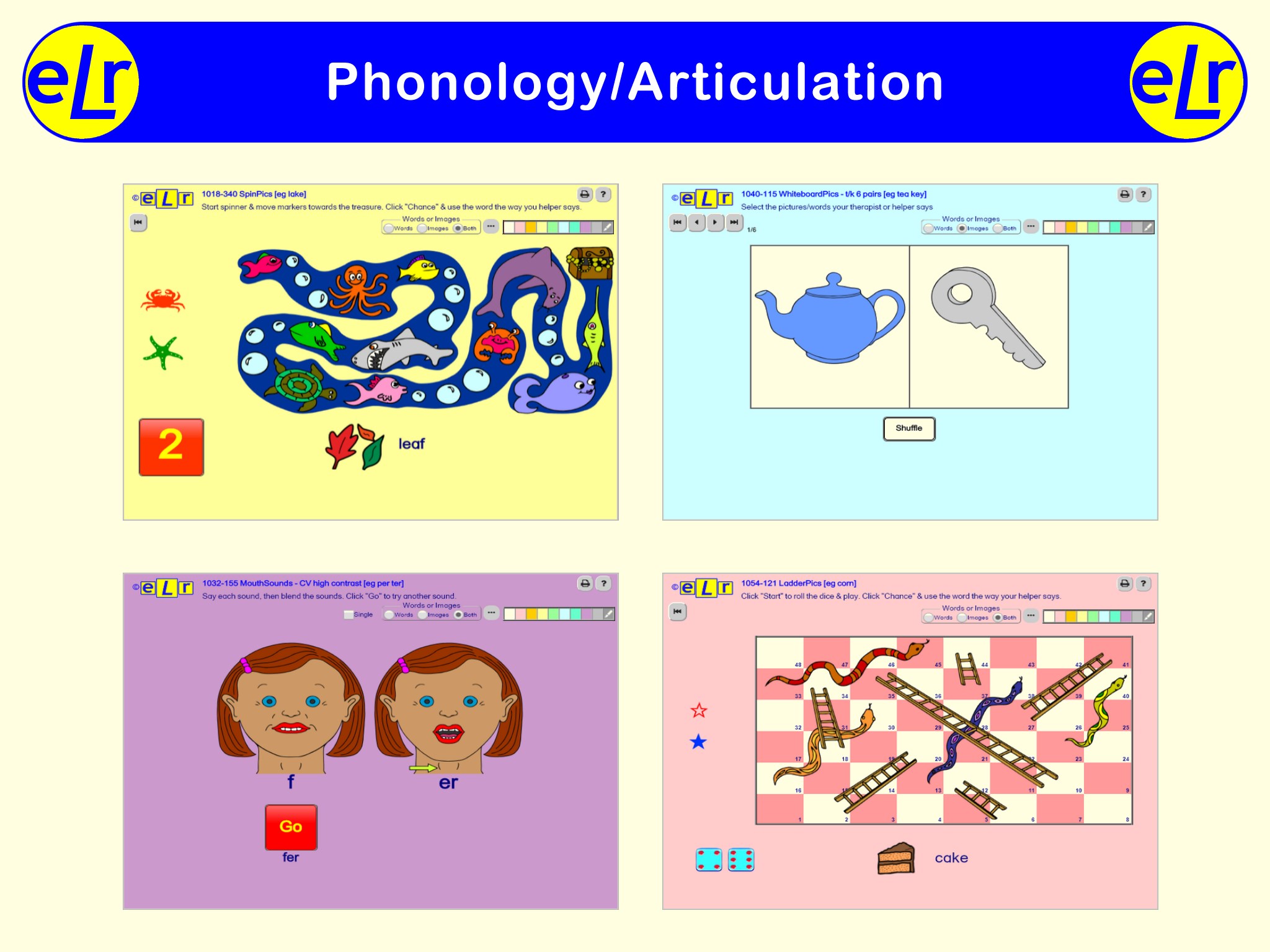 eLr contains more than 14,850 interactive activities covering a wide range of speech, language, and literacy targets. It is a comprehensive set of online therapy resources which allow speech and language therapists to deliver specifically targeted therapy for all ages. It may be used for flexible face2face or teletherapy sessions with minimal preparation time.