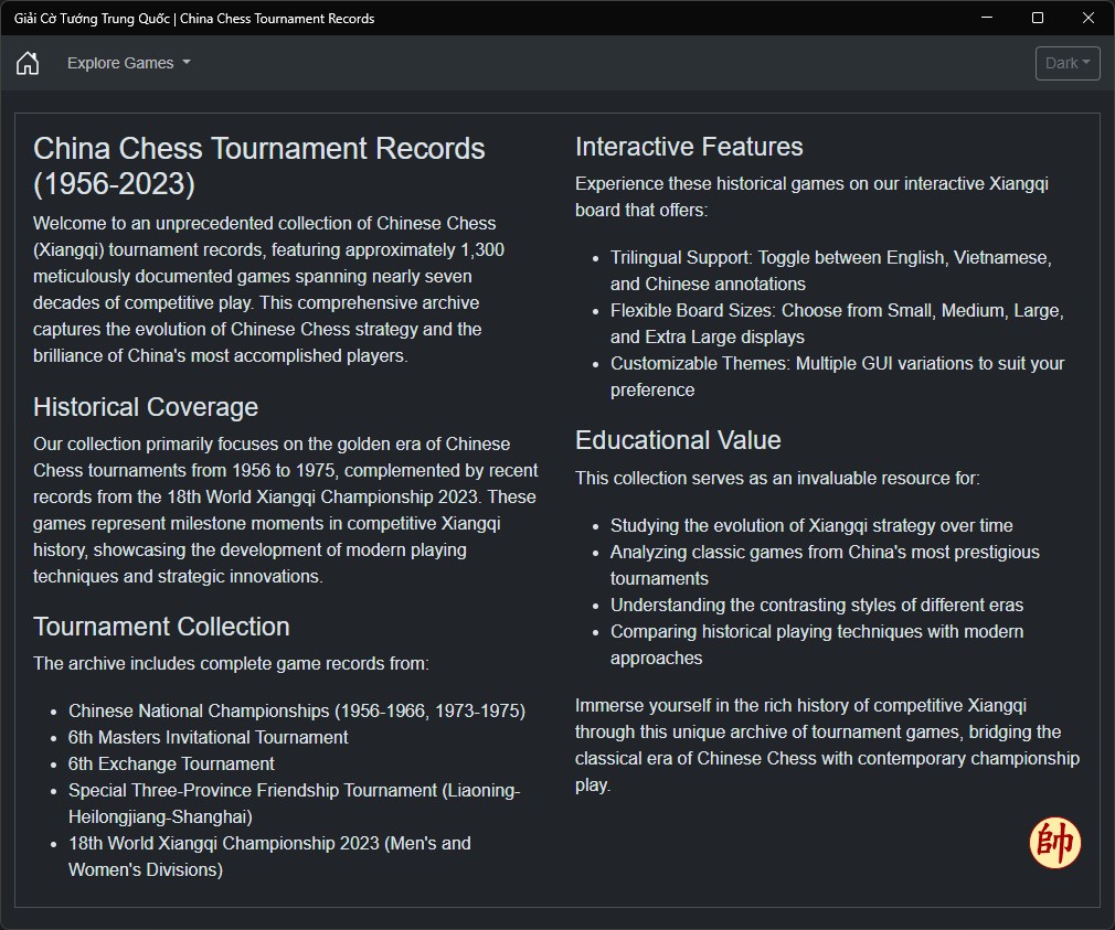 Welcome to an unprecedented collection of Chinese Chess (Xiangqi) tournament records, featuring approximately 1,300 meticulously documented games spanning nearly seven decades of competitive play. This comprehensive archive captures the evolution of Chinese Chess strategy and the brilliance of China's most accomplished players.