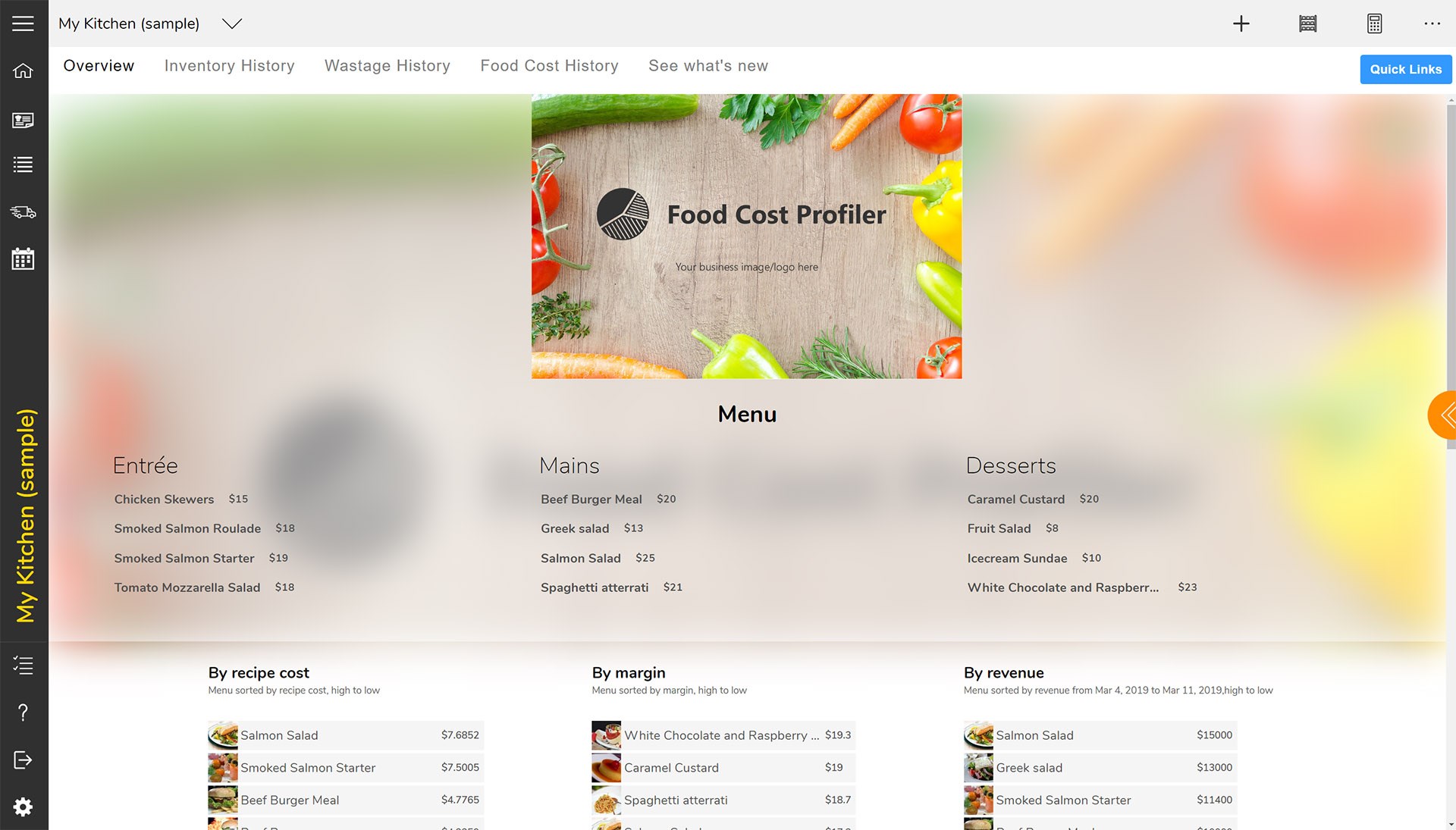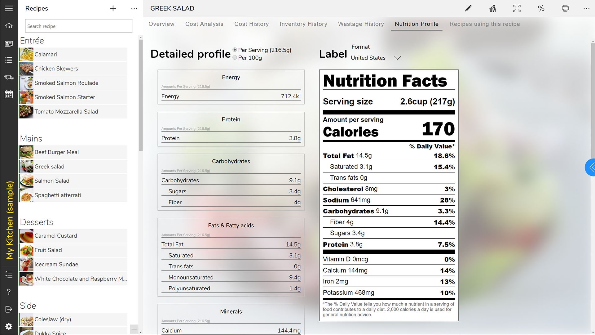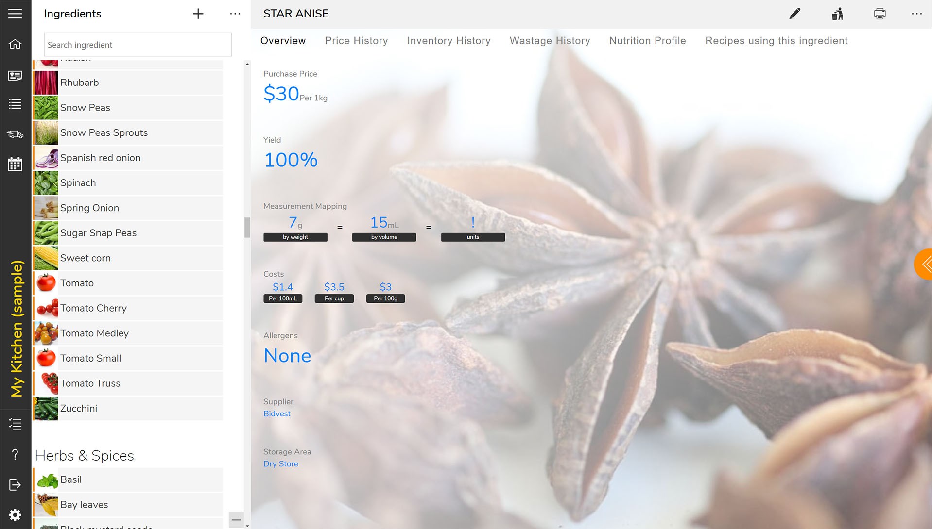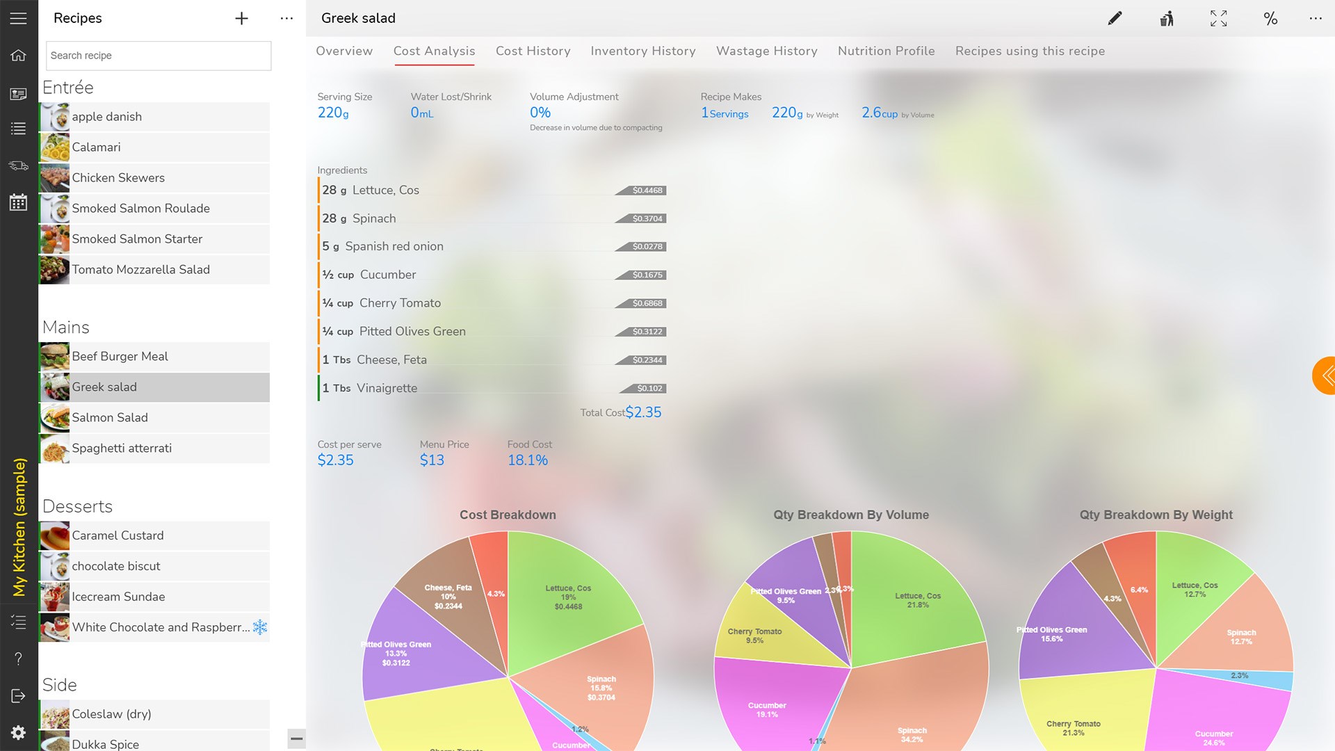 A valuable tool for anyone in food business. Recipe costing, inventory, track wastage, actual cost, ideal cost, nutrition profile, prep list, order list, banquet planning, kitchen calendar etc