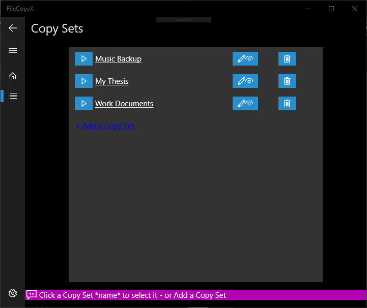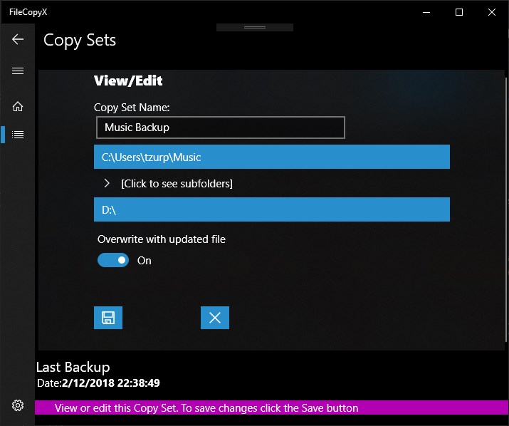 The fastest UWP backup utilityGet full indication about your backup stateCreate and manage any number of backup sessions (Copy Sets) for your photos, music, documents or other filesChoose whether to overwrite old backup with updated filesAn option to simulate backup and get the backup snapshot without actually writing data to the destination driveSee Copy Set backup history
