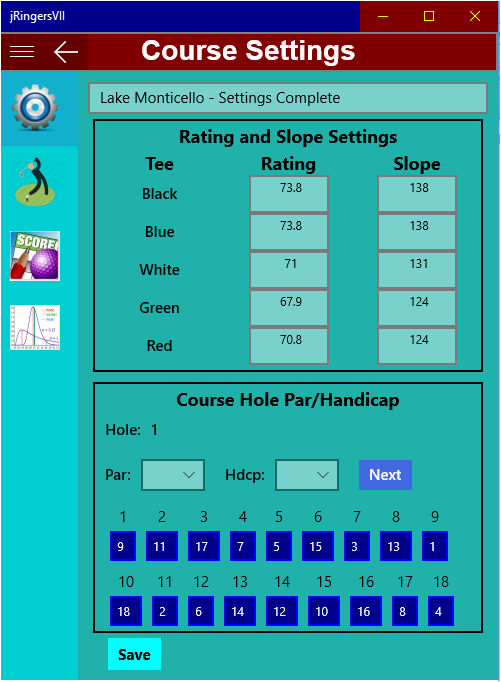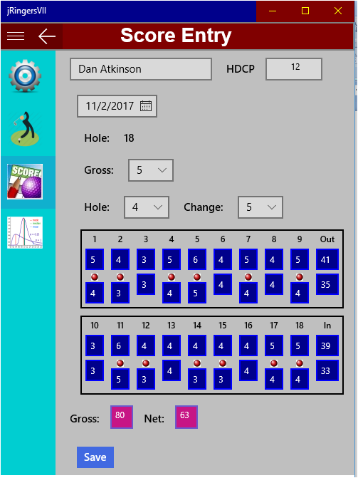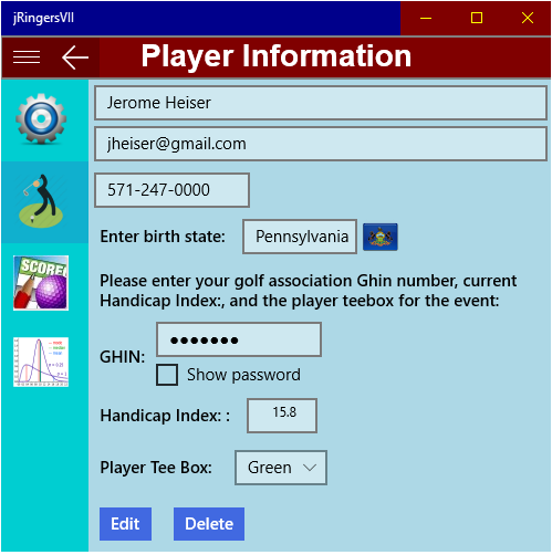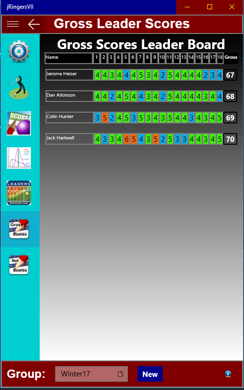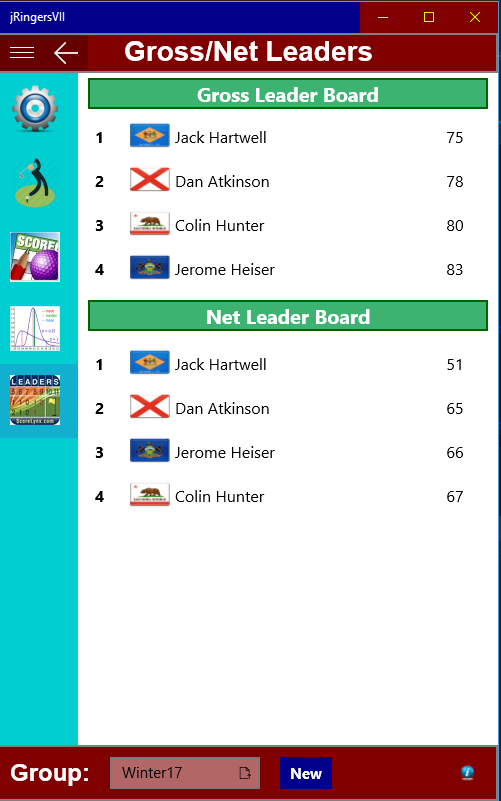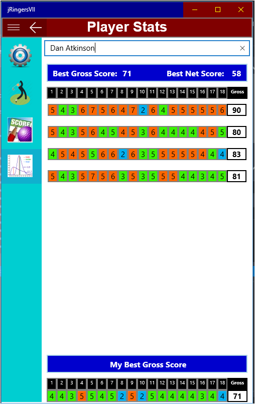 jRingersVII provides data management for individual or group golf scores consisting of the very best shot scored on each hole at a specific course and on the same tees. This type of scoring is often referred to as Ringer scoring. This app manages those scores for both the best gross and net score established. Net scoring is based on user handicap input for the round played. This app allows managing multiple groups with easy access between groups in the same session. When the main page is accessed, player(s) best gross and net score leader boards are updated and displayed. Individual statistics for gross scoring can be displayed with color coding to discern scoring as well as best score on each hole. Gross and net hole by hole scores can be displayed collectively for all players according to their standing. The app also supports both 9-hole and 18-hole league formats.