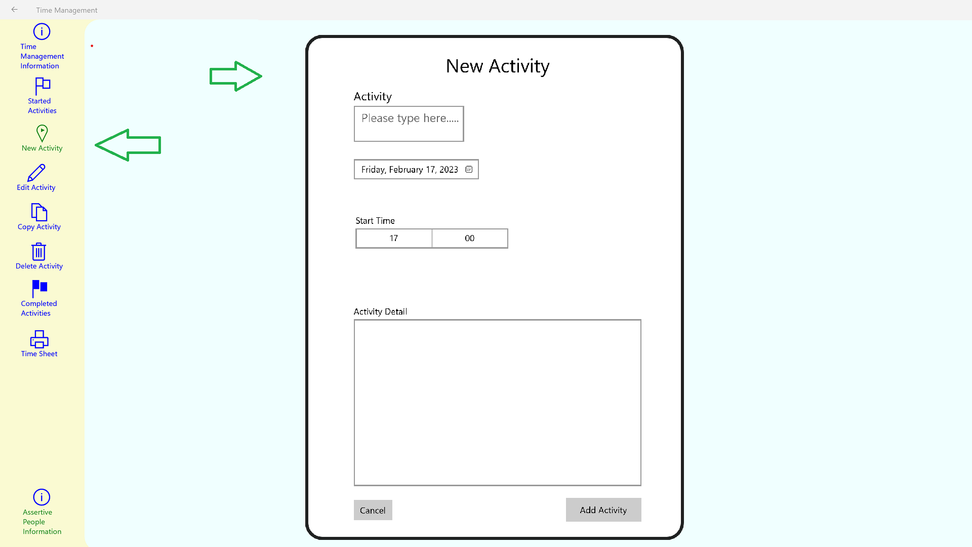 The Time Management database will store Activities, which can be added, edited, copied, completed and deleted from a Time Sheet designed to both show currently open and finished Activities. A separate page lists all completed activities and gives a indication of the time taken for completion.