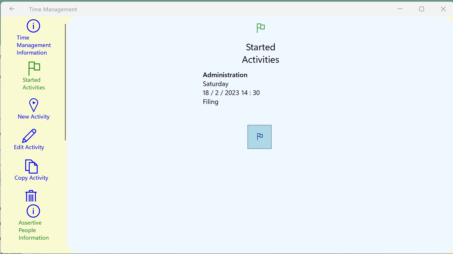 To complete a task, an icon with a flag is shown below each task on the time sheet, after it has been added as a new activity. Feel free to alter the finish time if you wish, but remember to press the tick button if you do.