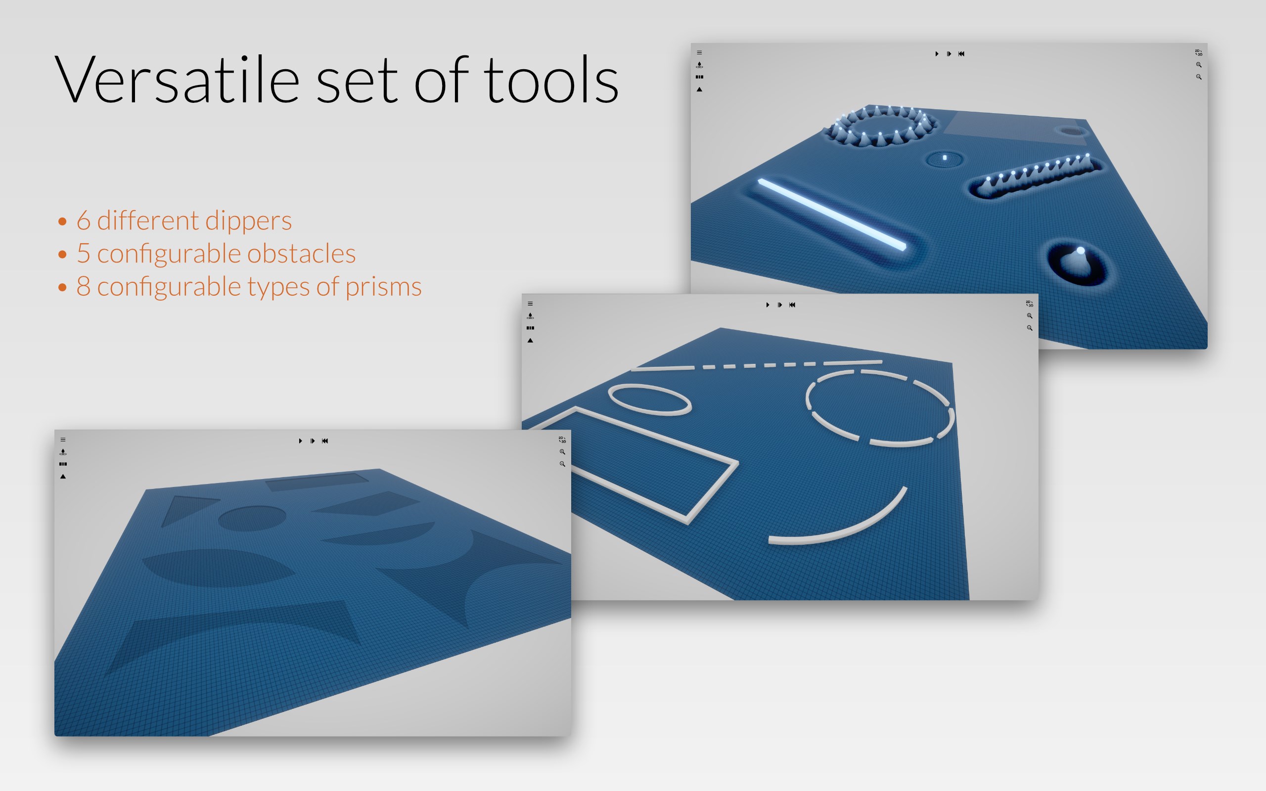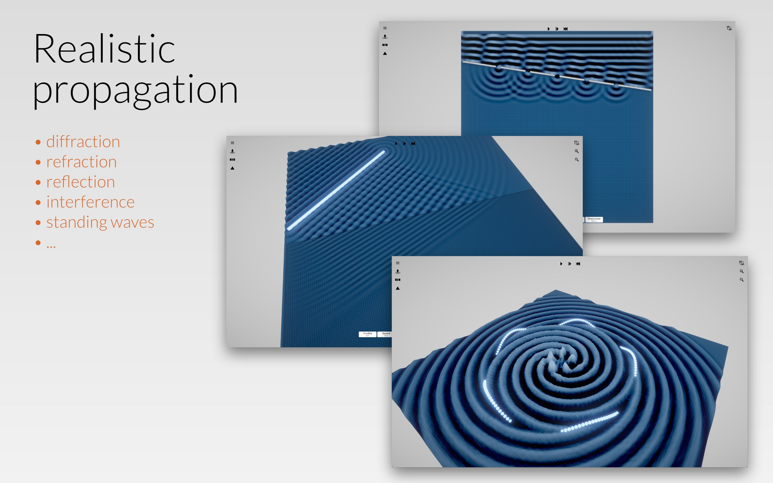 Creation of different types of exciters, walls, gaps and material transitionsRealistic simulation of known wave phenomena such as reflection, refraction, diffraction, interference, standing waves, ...Stopping and continuing the simulation step by step2D and 3D modeEasy to use with mouse or touch (on multitouch devices)