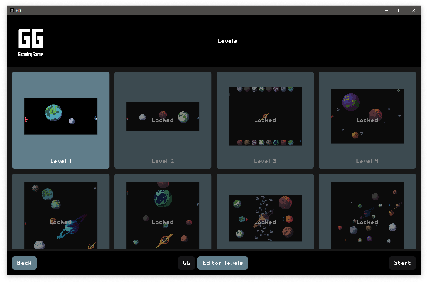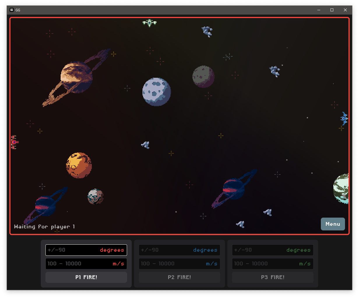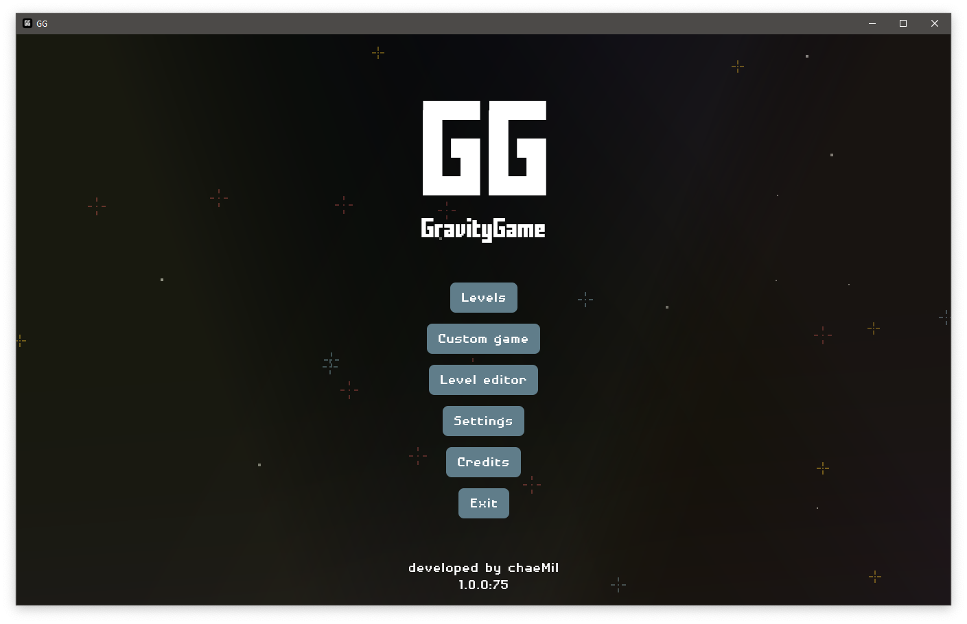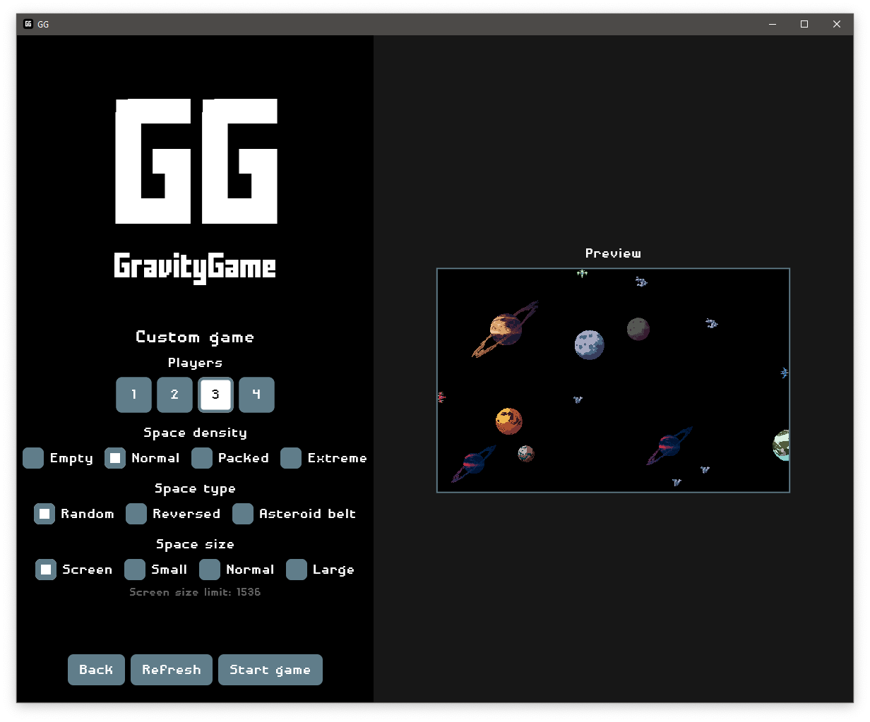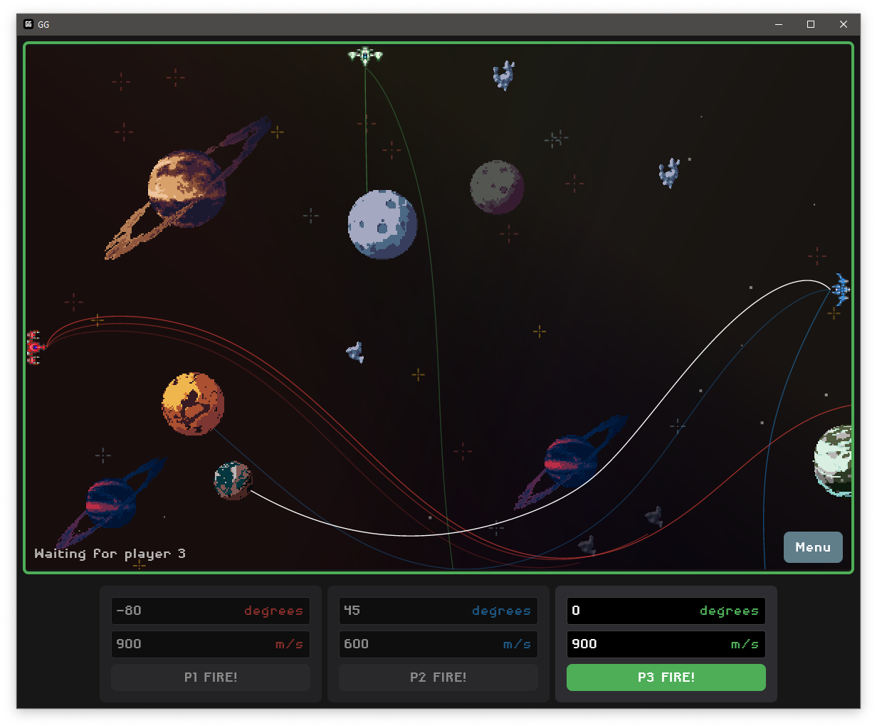 Gravity Game or GG for short is a game where 1 to 4 players are fighting against each other or an AI in universe filled with planets and asteroids. Each turn player inputs angle and velocity for his projectile to be fired between the gravity influencing planets and other players ships. The goal is to stay alive and eliminate all other players.
