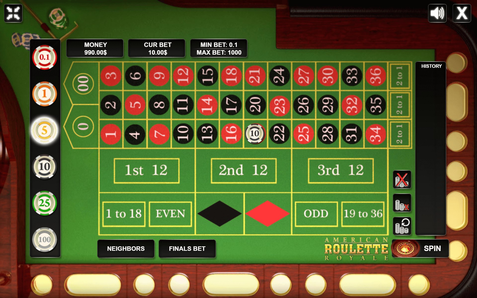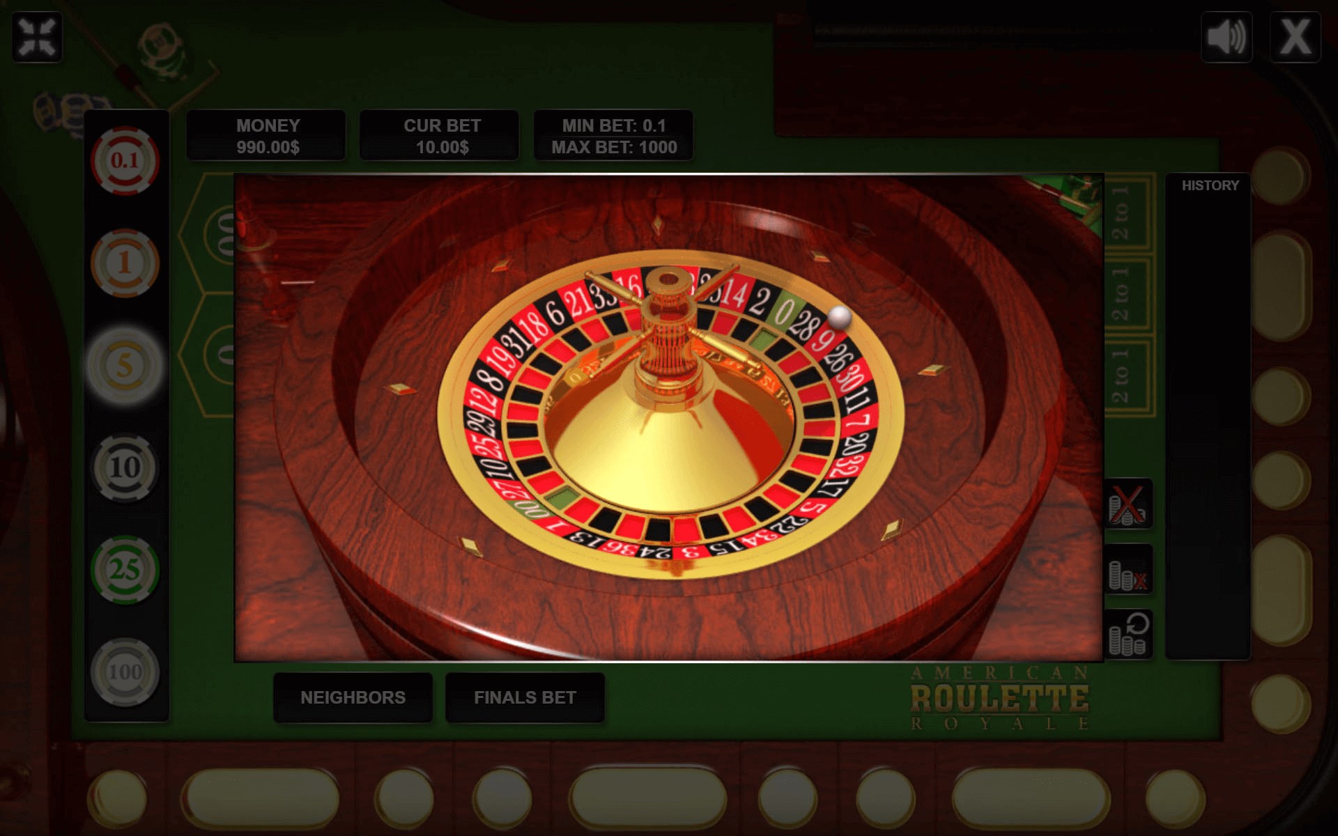 The game contains all the main roulette game features like Voisins zero, tier, orphelins, neighbor,final bets.