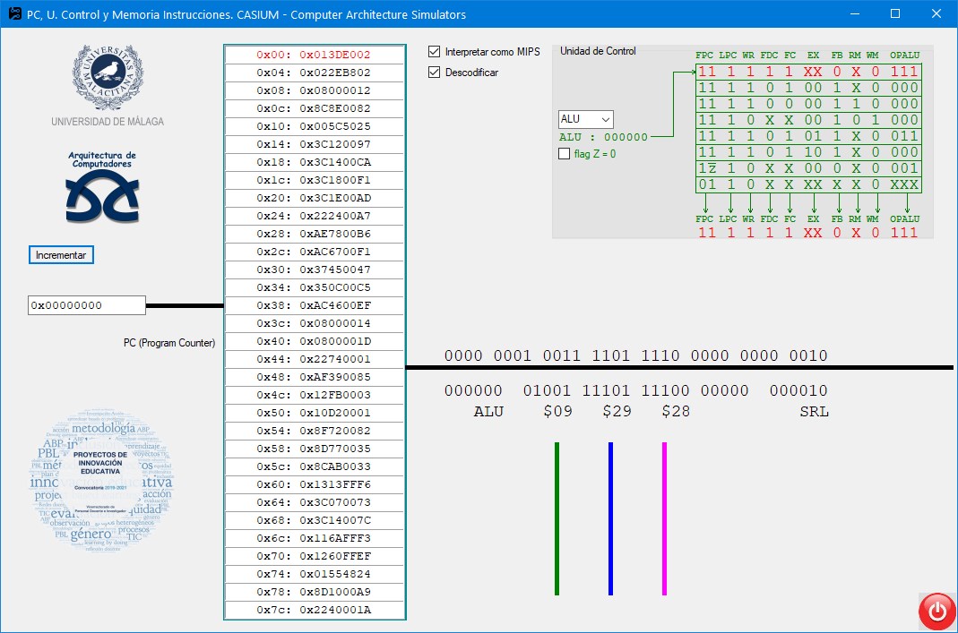 Por este motivo, MIPS sim está orientado a mostrar al alumno de una asignatura de fundamentos del hardware del computador qué ocurre internamente durante el ciclo de instrucción, y no durante un programa extenso, como otros simuladores. En este sentido, MIPS sim se inicializa con la memoria de instrucciones precargada con 32 instrucciones elegidas pseudo-aleatoriamente.