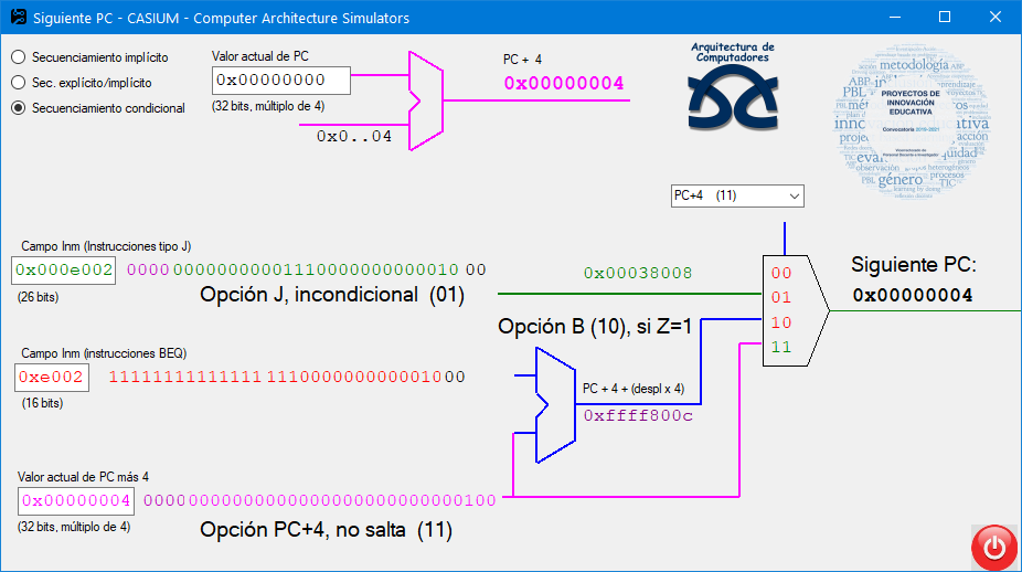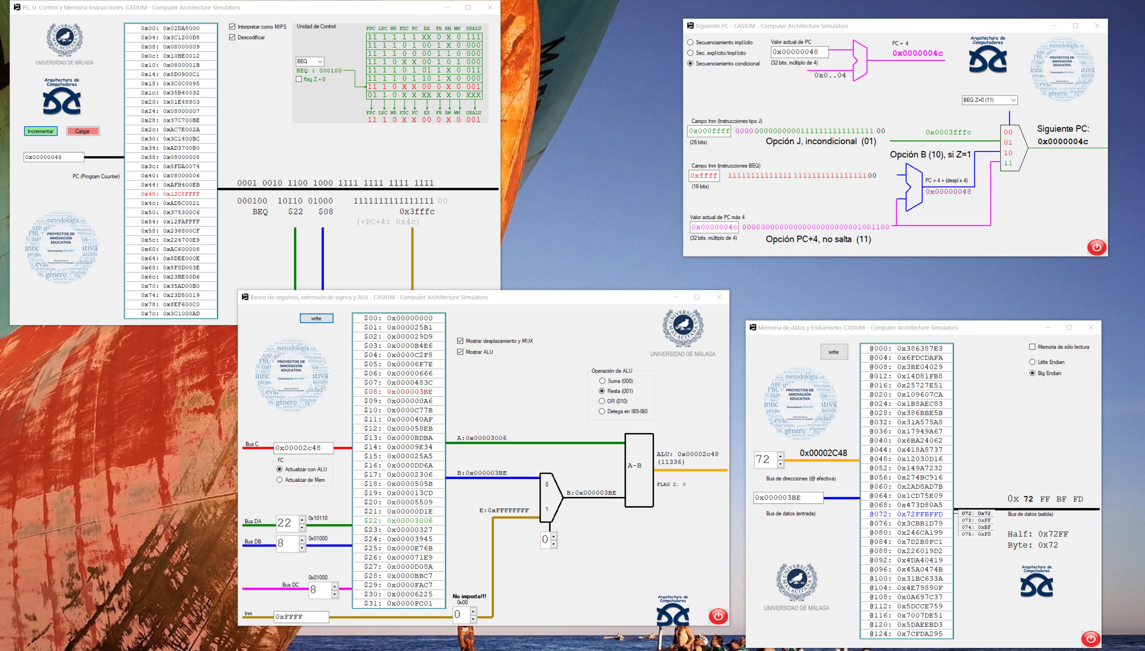 Visualizador del funcionamiento de una memoria de instrucciones y la unidad de controlVisualizador del funcionamiento de una memoria de datosVisualizador del cálculo del siguiente valor del contador de programaVisualizador de un banco de registros con dos puertos de lectura, uno de escritura, y la ALU