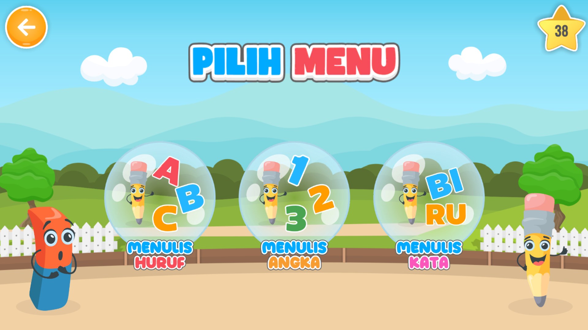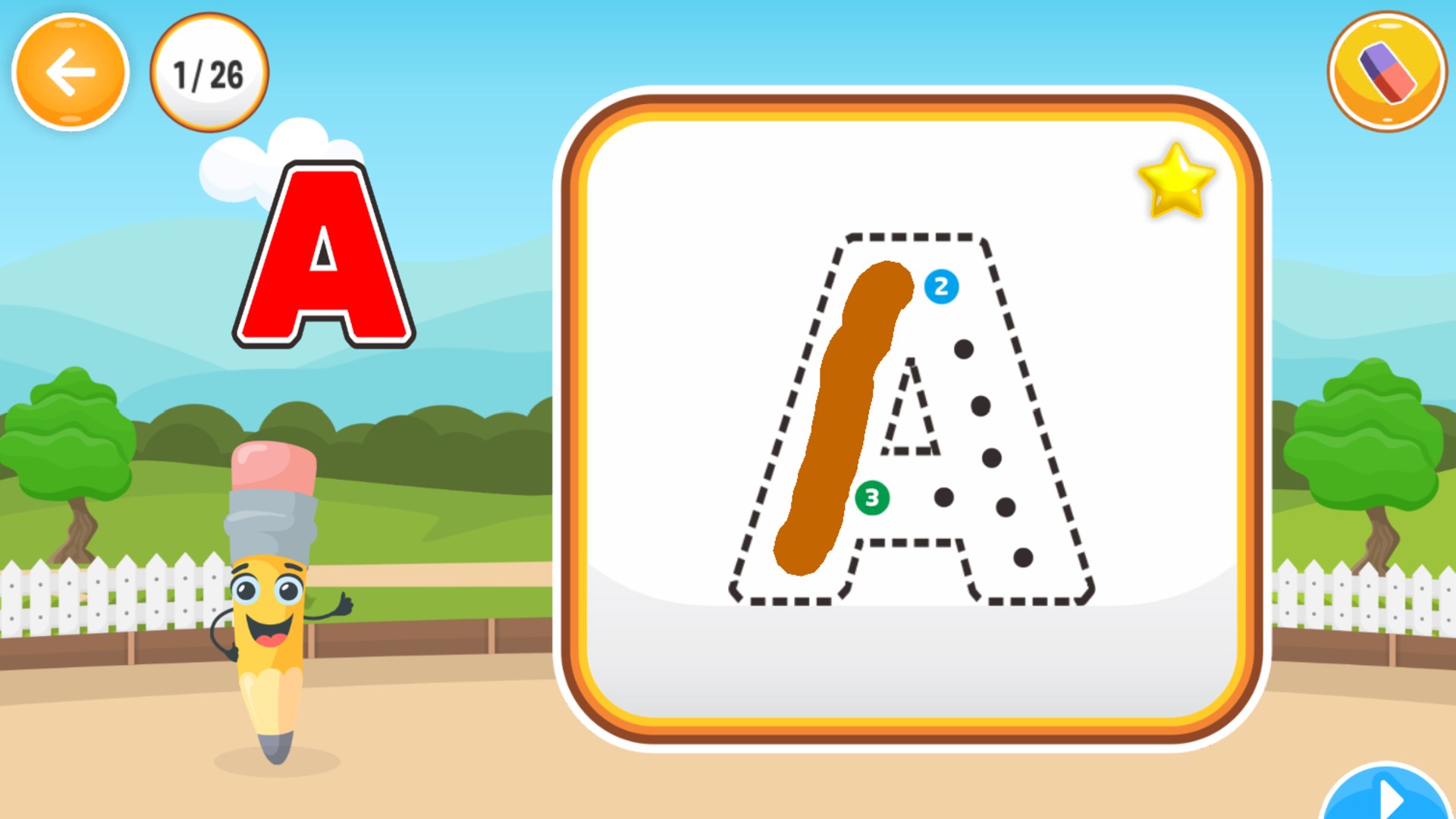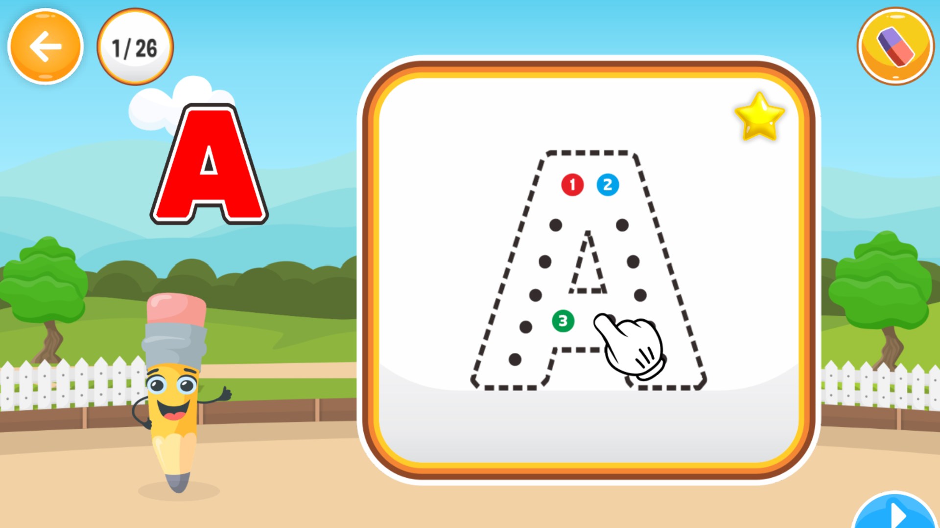 Pada pemainan ini anak-anak akan belajar menulis huruf alfabet, angka, dan kata. Konsep pembelajaran pada aplikasi ini dirancang secara interaktif disertai permainan menarik dan suara yang menarik sehingga anak-anak tidak bosan saat bermain.