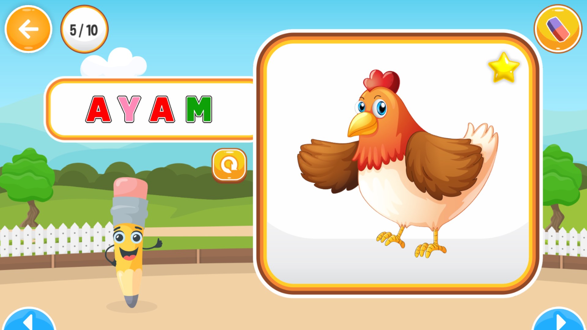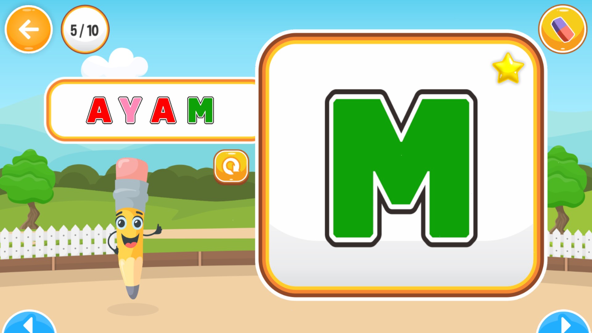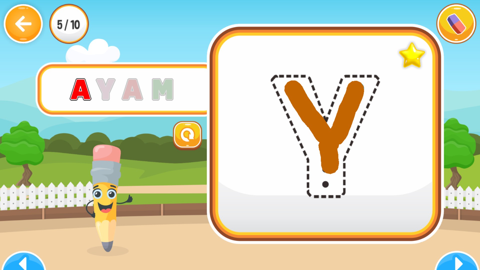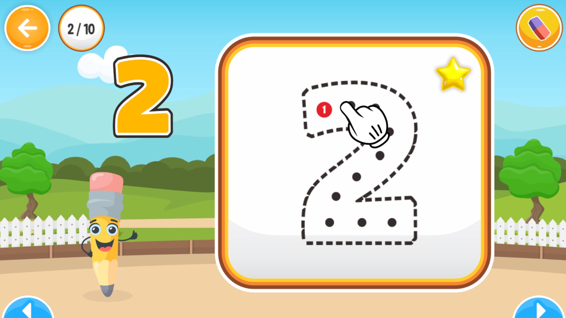 Pada pemainan ini anak-anak akan belajar menulis huruf alfabet, angka, dan kata. Konsep pembelajaran pada aplikasi ini dirancang secara interaktif disertai permainan menarik dan suara yang menarik sehingga anak-anak tidak bosan saat bermain.