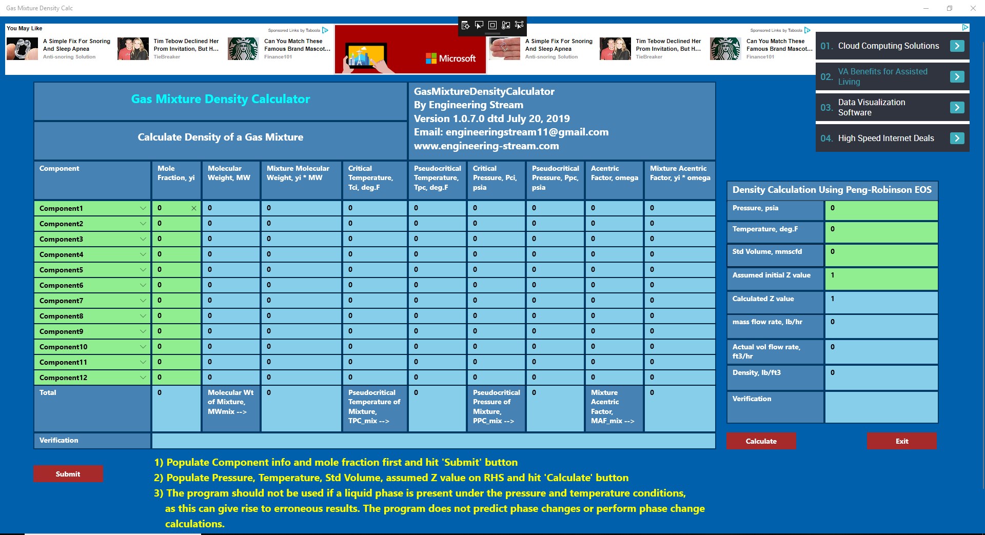 The software calculates the density of a mixture of gases using Peng Robinson's equation of state.