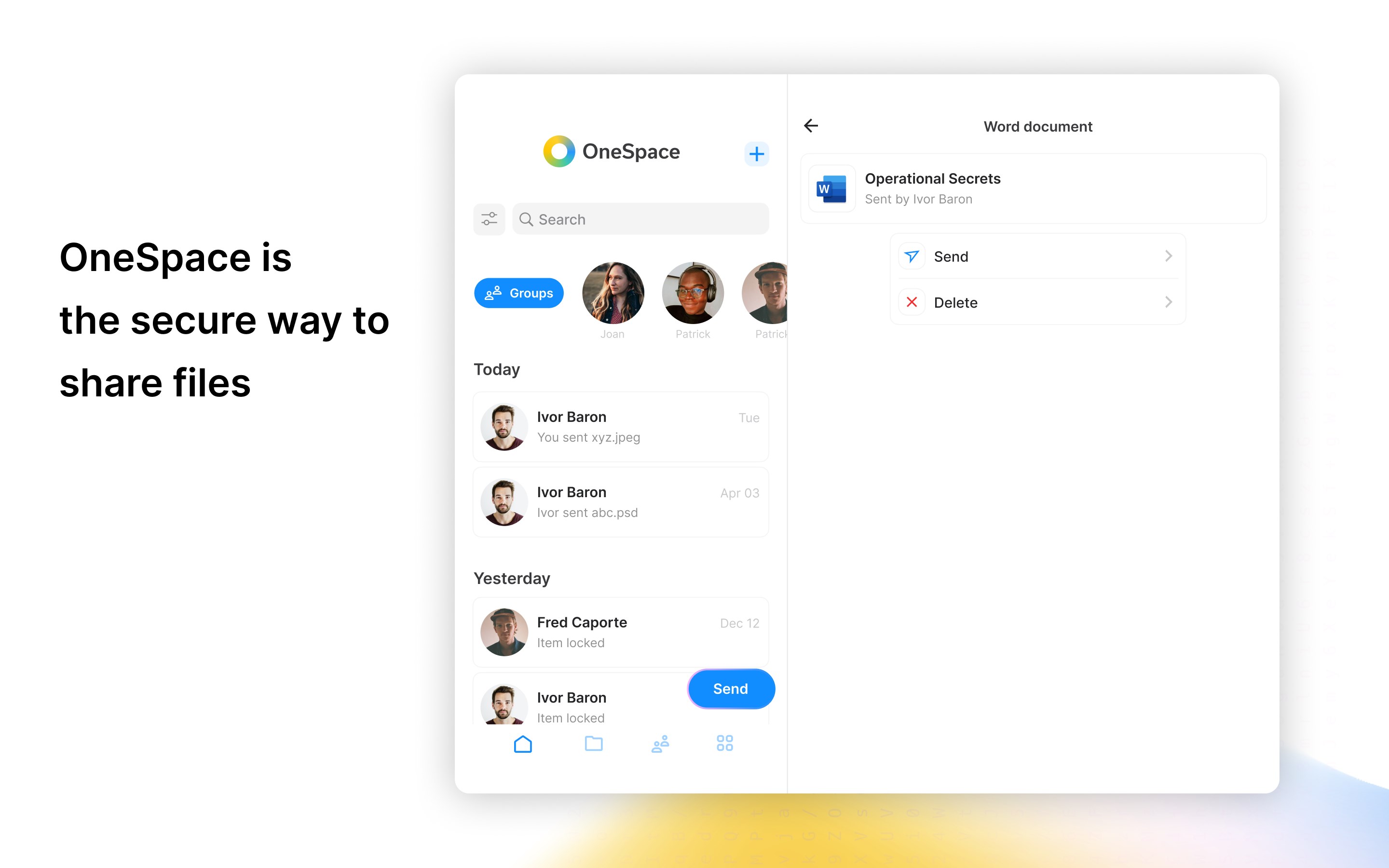 OneSpace is a safe filesharing app. Send files securely with end-to-end encryption. Create contacts and send files encrypted with your contacts private key. Sending to someone who doesn’t use the app? No problem. Send a file link by email, protected by a password.