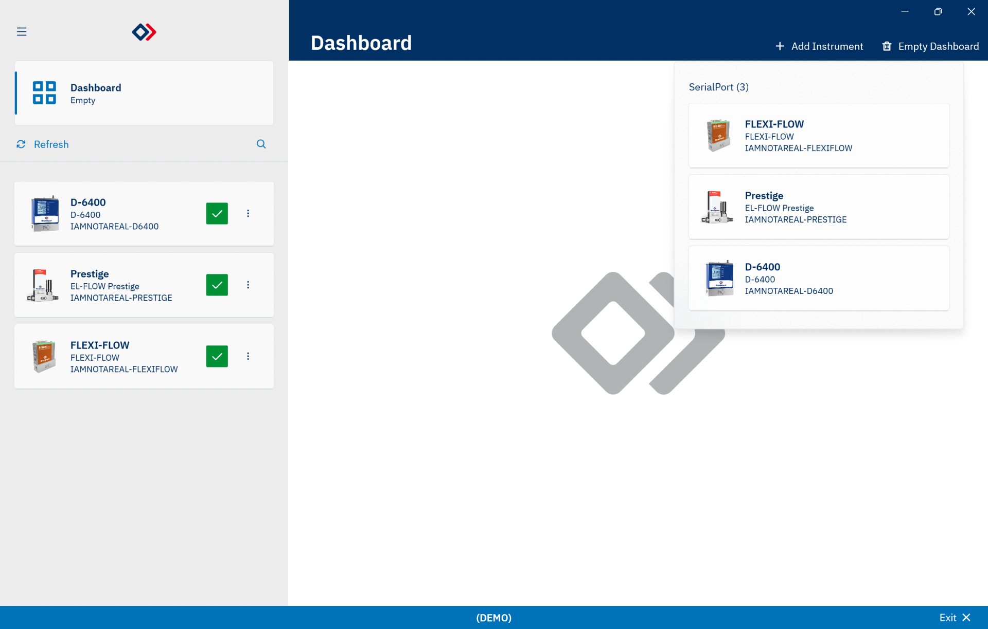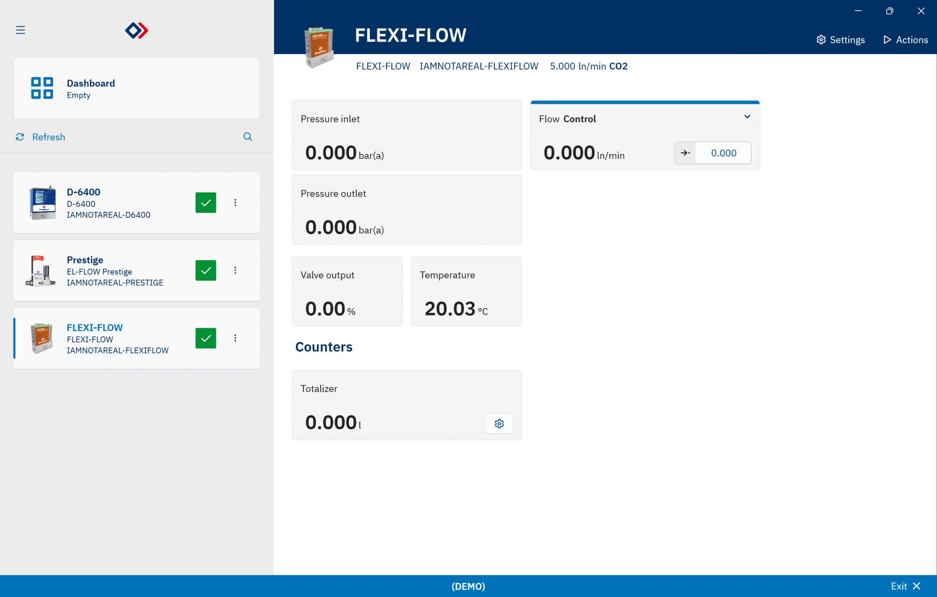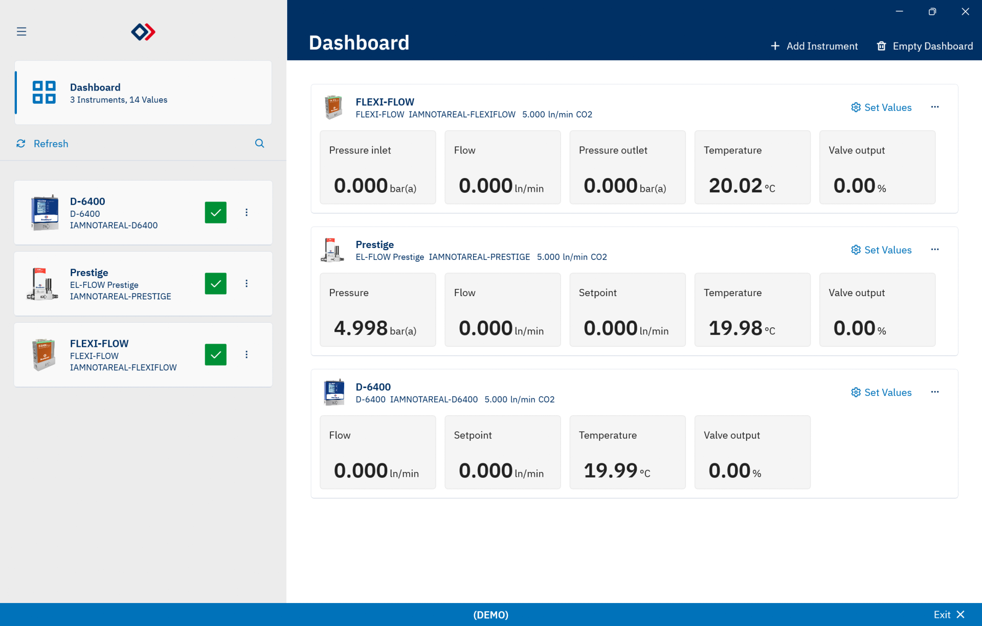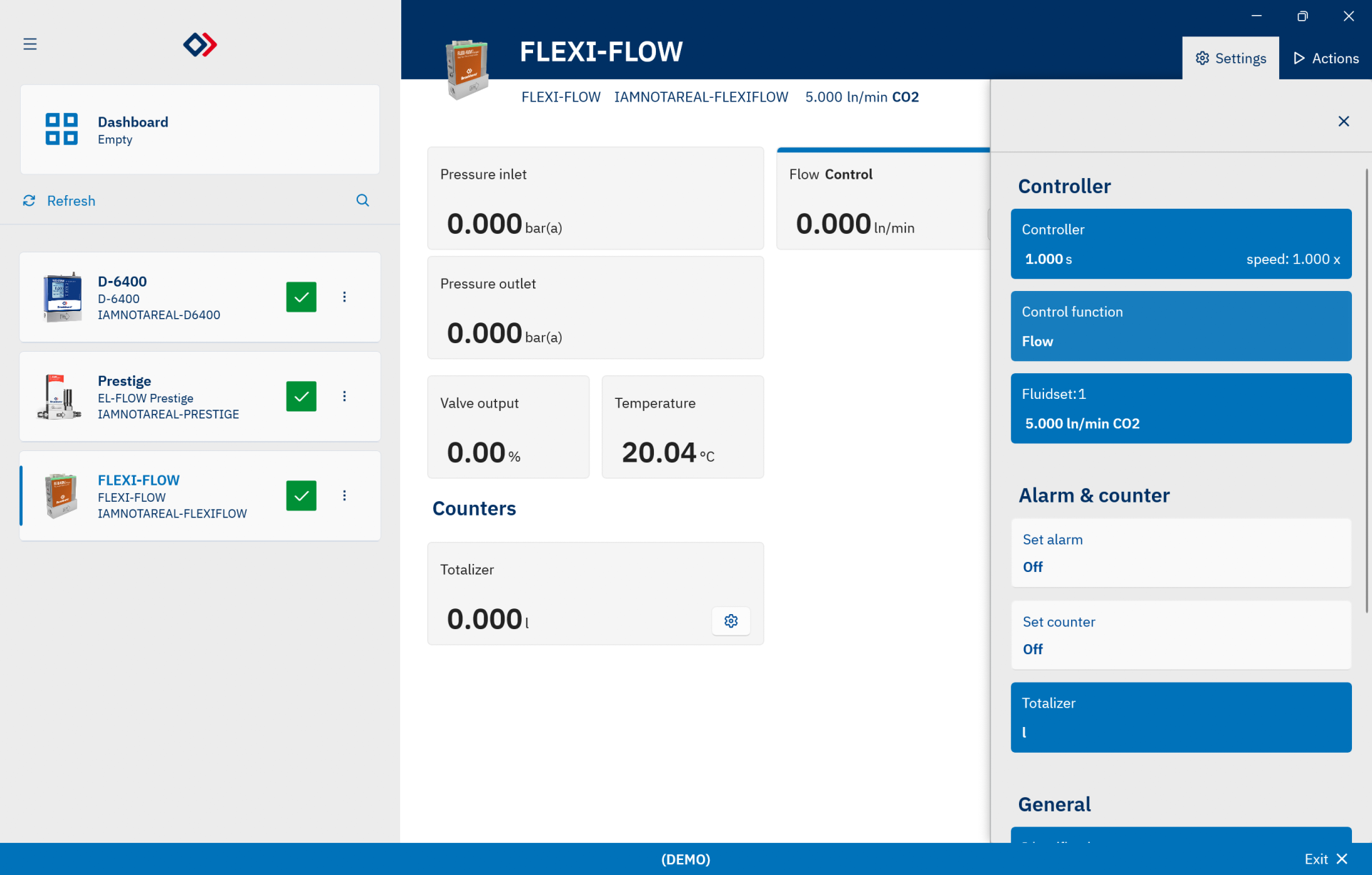 Configurating: Controller, Alarms, Counters, Totalizer, Fieldbus, and Fluid settings of Bronkhorst instruments.Diagnostics: Check and visualize the status of connected instruments according to Namur NE-107.Dashboard: Configure your own personal dashboard to view and control multiple instruments at a glance..Fluids: Add or change the fluid settings of your instruments with FLUIDAT on board.Measure: Visualize measurements in a graph, and export the data, with responsive controls for axes, colors, visibility of signal, a cursors for measurements, and more.