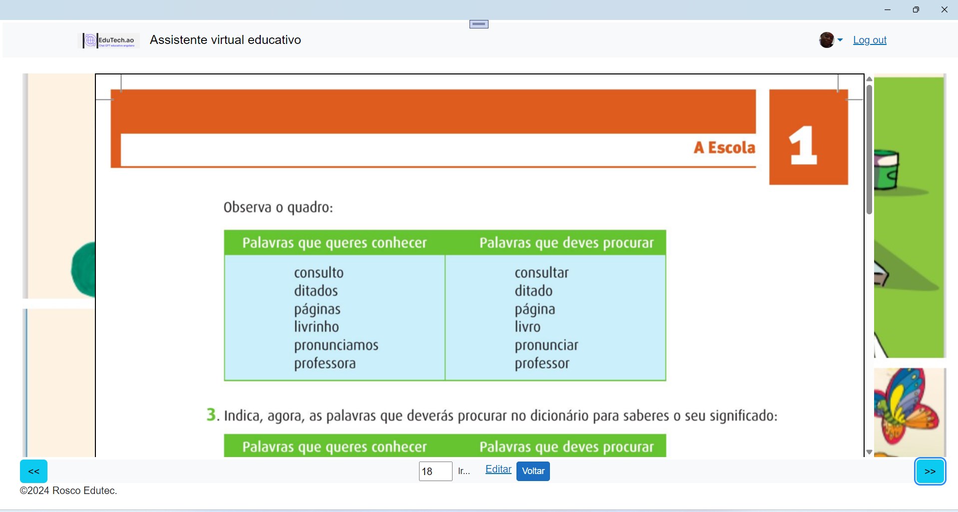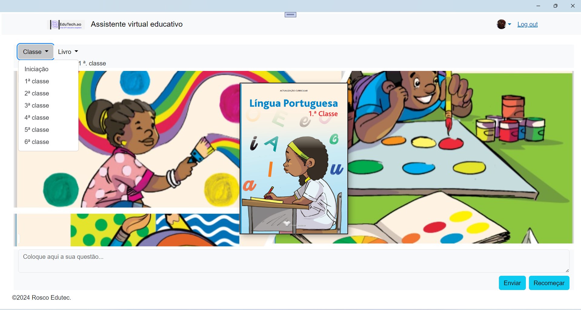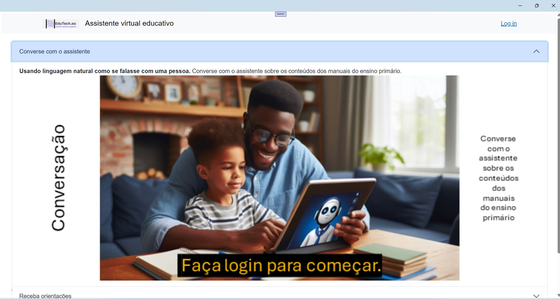 Solução inovadora composta por um assistente virtual educativo, que explica os conteúdos dos manuais oficiais do ministério de educação simulando a linguagem de um ser humano que pode ser acedido a qualquer momento e em qualquer lugar, para ajudar os pais e encarregados de educação dos alunos do ensino fundamental em Angola a acompanhar e apoiar o processo de aprendizagem dos filhos