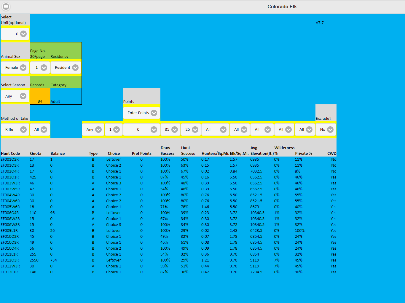 Easy selection of filtering criteria based upon pull down menus.Over 20 selection criteria available to fine tune your application to your preferences.Current Draw Results data and Harvest data. Will update tool as new data become available (PWA).Hunt Codes for Colorado ElkBased upon Colorado Department of Wildlife Big Game Statistics.