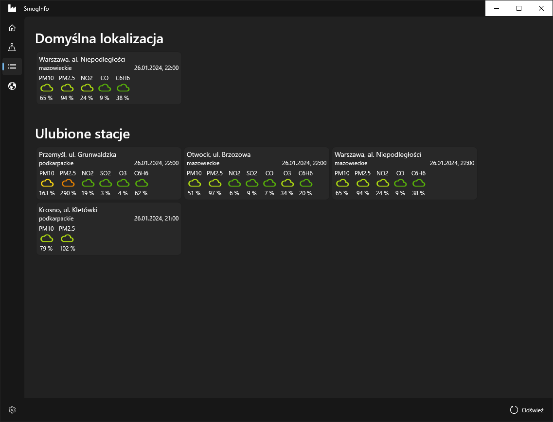 Aplikacja wyświetla dane dla 166 aktywnych stacji pomiarowych na terenie całej Polski.