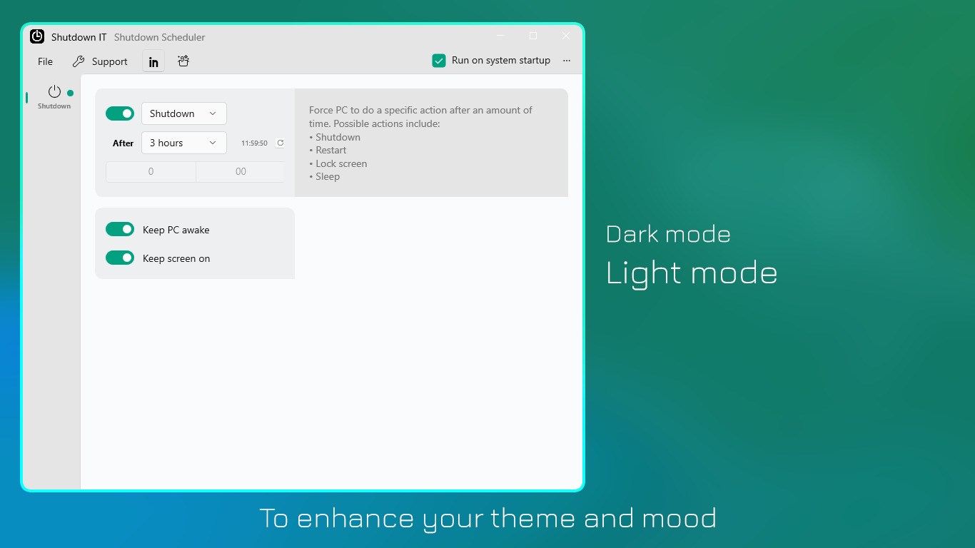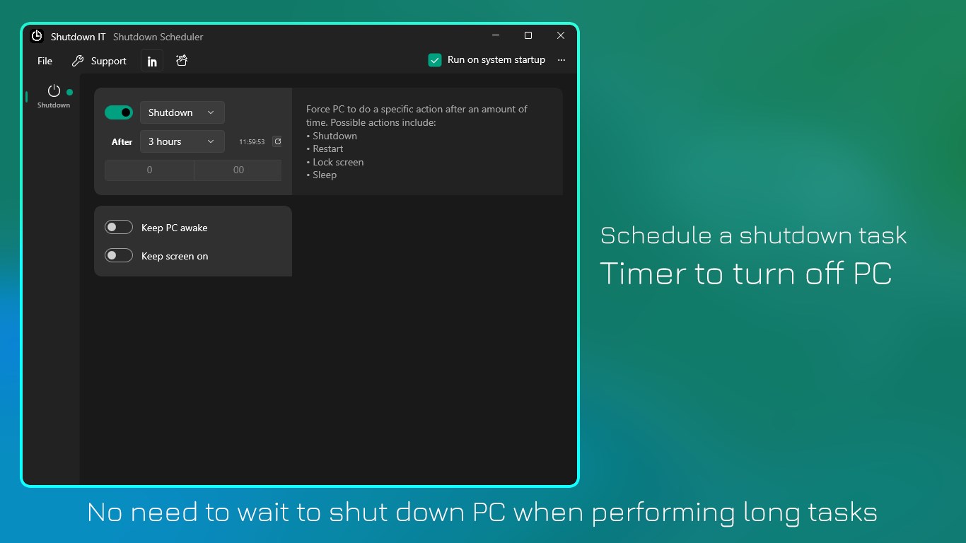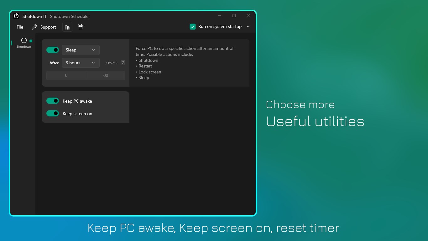 Windows shutdown timer, count down time or set specific time.Timer for shutdown, startup, sleep, screen lock.Keep the computer from sleeping.Keep the screen on.