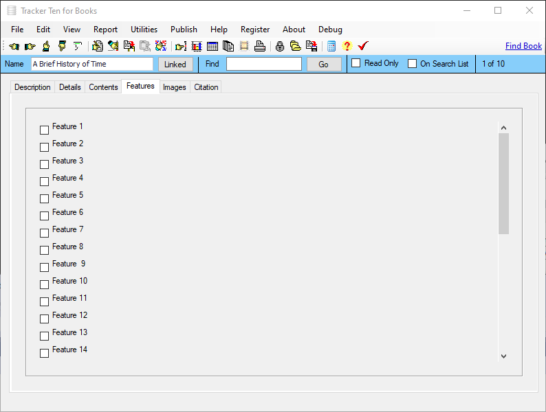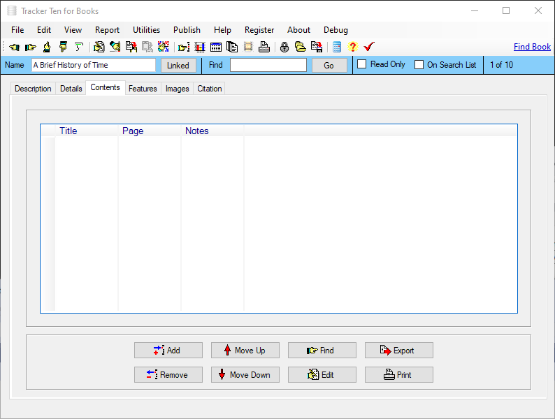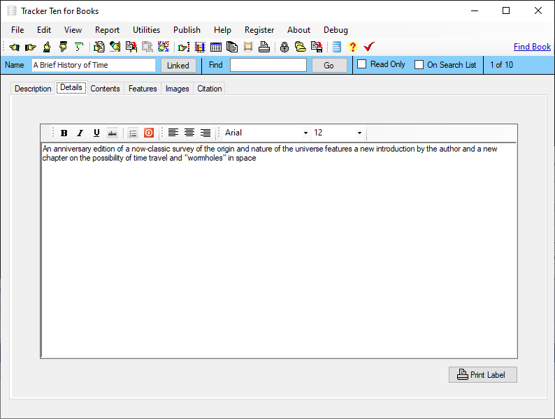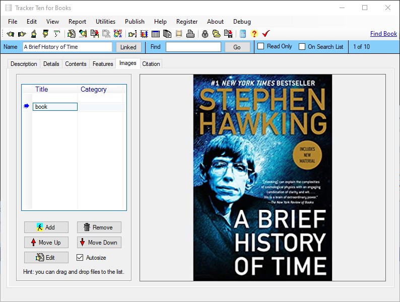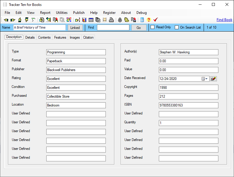 Tracker Ten for Books is a complete windows inventory system that will help you get you organized fast. The software is great for all types of fiction and non-fiction books and is suitable for home users, business offices and non-profit organizations. The software features advanced reporting, graph generation, item history tracking, customizable data fields, rich text format notes, data export, a powerful search engine, cost and value tracking (based on values you enter yourself) and automatic web page creation and upload. The software can also generate full color reports, incorporating images; great for accurate insurance record keeping and automatic catalog generation. The software is ideal for both business and personal use. The software can also automatically import book title, publisher, copyright date, authors, pages and details after you enter the ISBN number using the "find book" link on the top of each record.