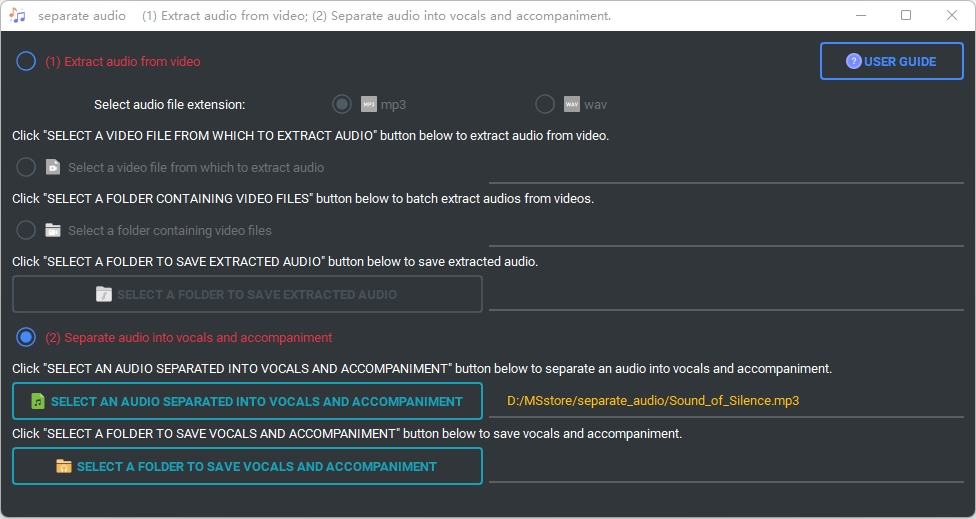 (2) Click "SELECT A FOLDER TO SAVE VOCALS AND ACCOMPANIMENT" button below to save vocals and accompaniment separated from the audio in a subfolder named after the audio filename. The selected folder path cannot contain spaces.