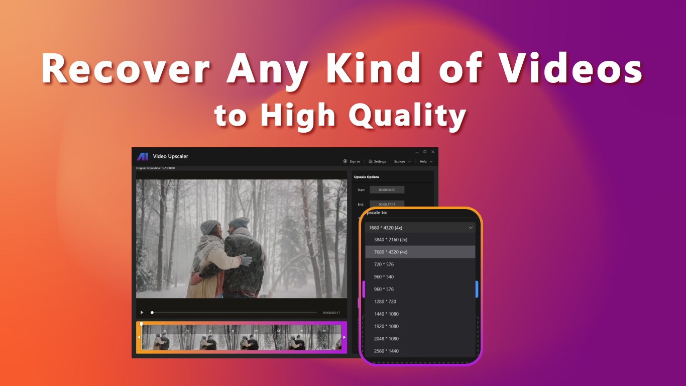 Increase the resolution of your videos up to 8K, making them clearer, sharper, and more detailed.Enhance the quality of your videos by reducing noise, artifacts, and blur, and improving colors, contrast, and brightness.Predict missing details that cannot be reproduced by traditional upscaling methods, such as hair, skin, edges, and landscapes.Work with various video formats, such as MP4, AVI, WMV, MOV, MKV, and more.
