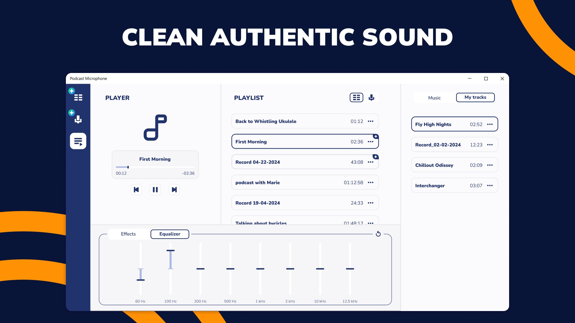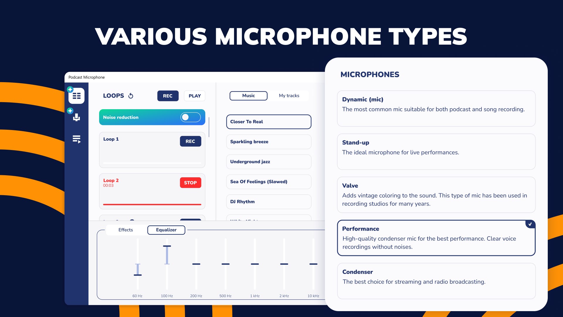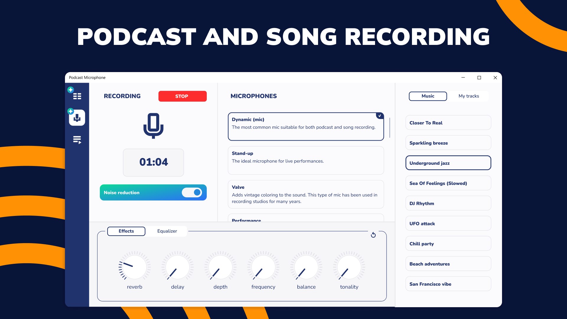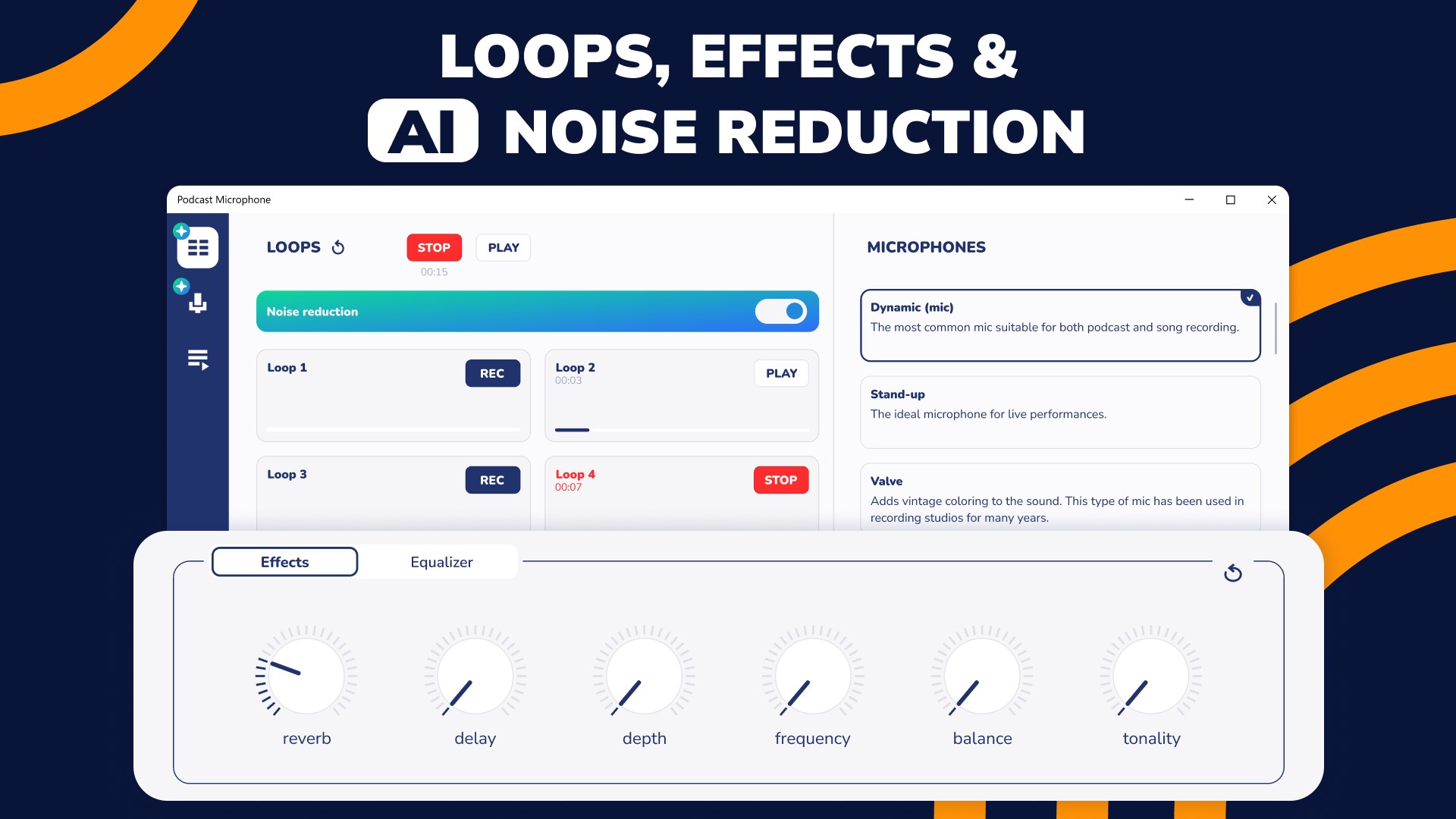 - Presets and effects - try out different microphones to hear how your voice sounds like to find the one that suits your format best