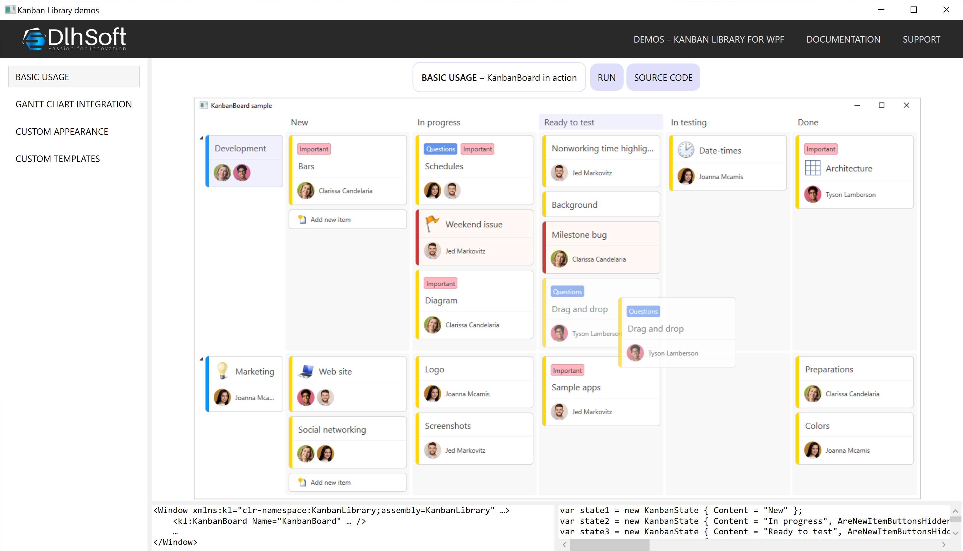 Provides a set of sample applications (with source code) that developers can use to learn about configuring the Kanban board component from DlhSoft Kanban Library for WPF.