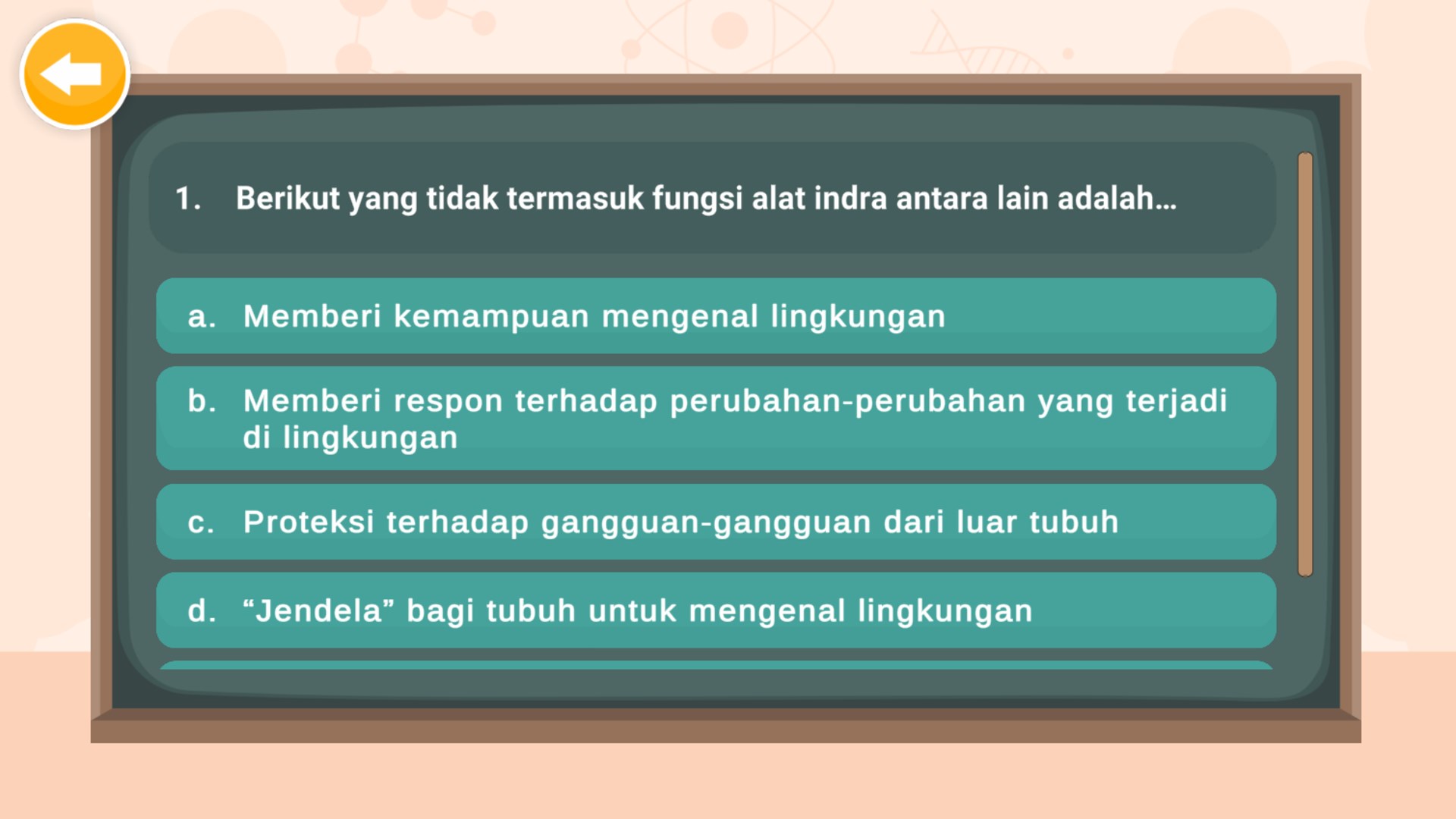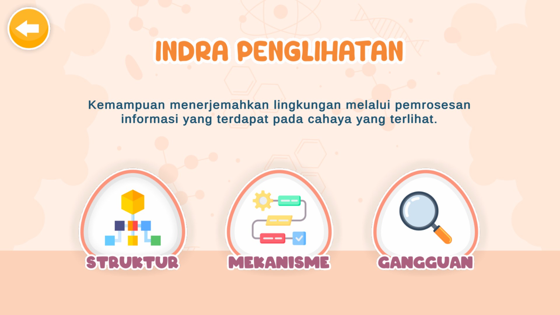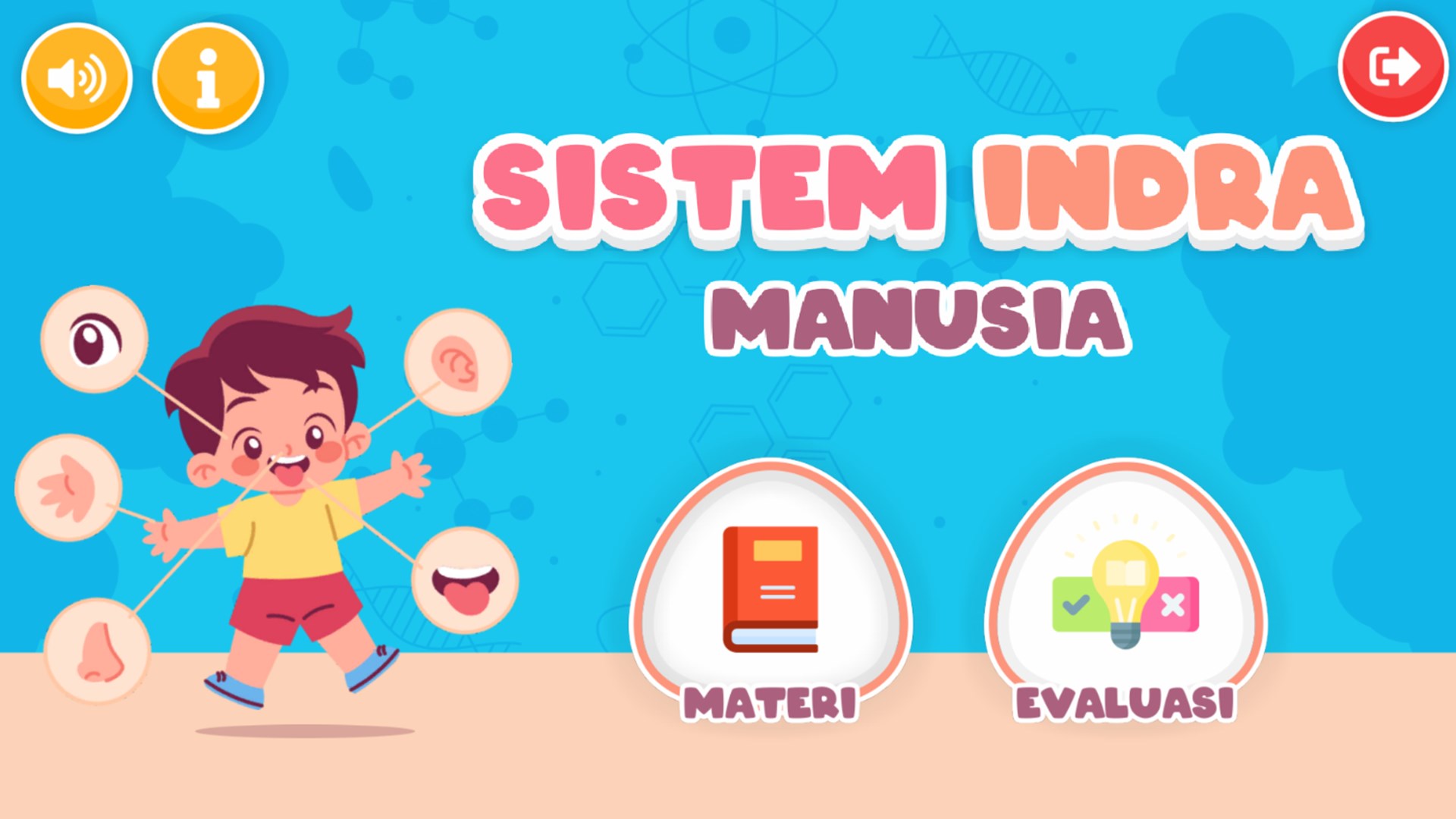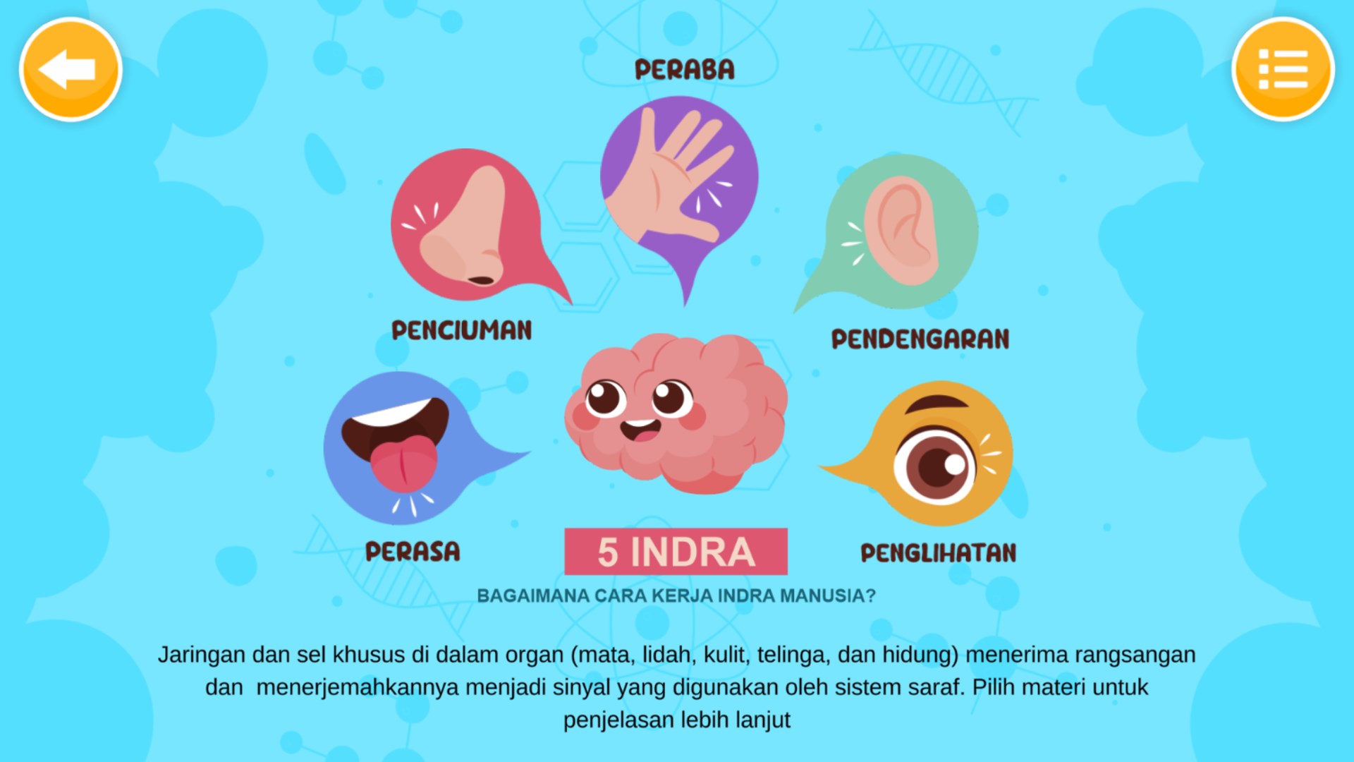 Aplikasi Sistem Indra Manusia berisi materi tentang 5 sistem indra manusia yaitu indra penglihatan, indra perasa, indra penciuman, indra pendengaran, indra peraba. Setiap materi berisi sub materi struktur, mekanisme, dan gangguan indra. Terdapat juga menu evaluasi untuk menguji pengetahuan mengenai materi sistem indra pada manusia.