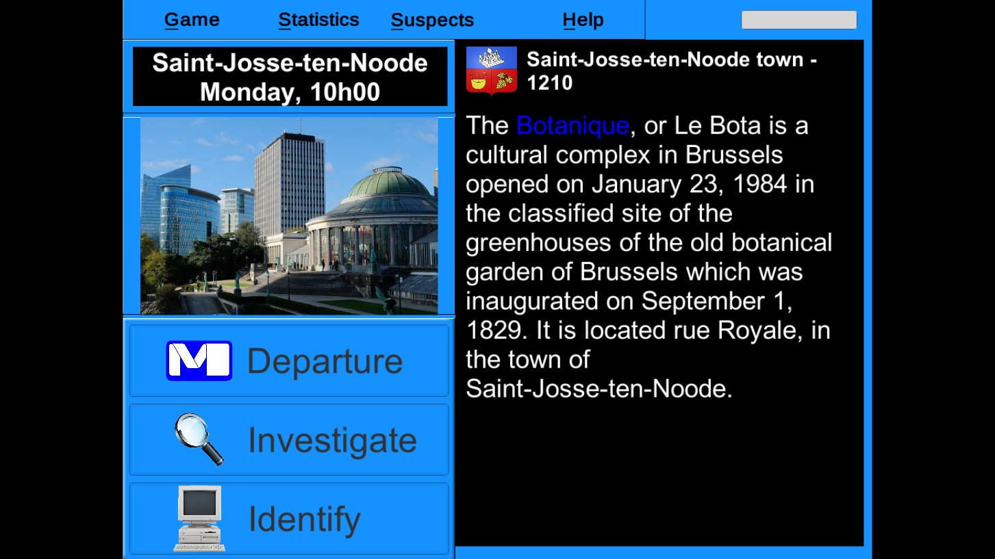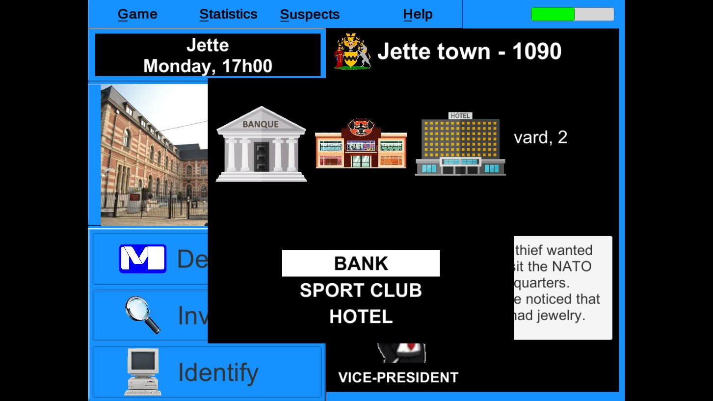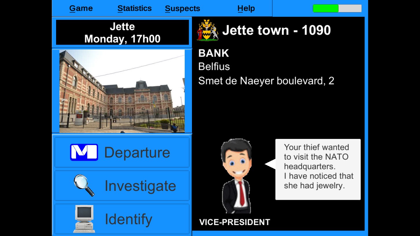 The adventure begins with the theft of a valuable object or work of art committed by a member of the B.A.D.. The player goes to the scene of the heist and the countdown begins. He interrogates the witnesses, gathers the clues that could reveal the identity and the next destination of the thief. The game therefore essentially mobilizes the player's geographical knowledge, invites him to visit various key places and teaches him to manage his time. Enigma to the test, he travels the city and must obtain an arrest warrant. To do this, he must have gathered enough clues and information about the thief during the adventure. The player must capture the thief and collect the loot.