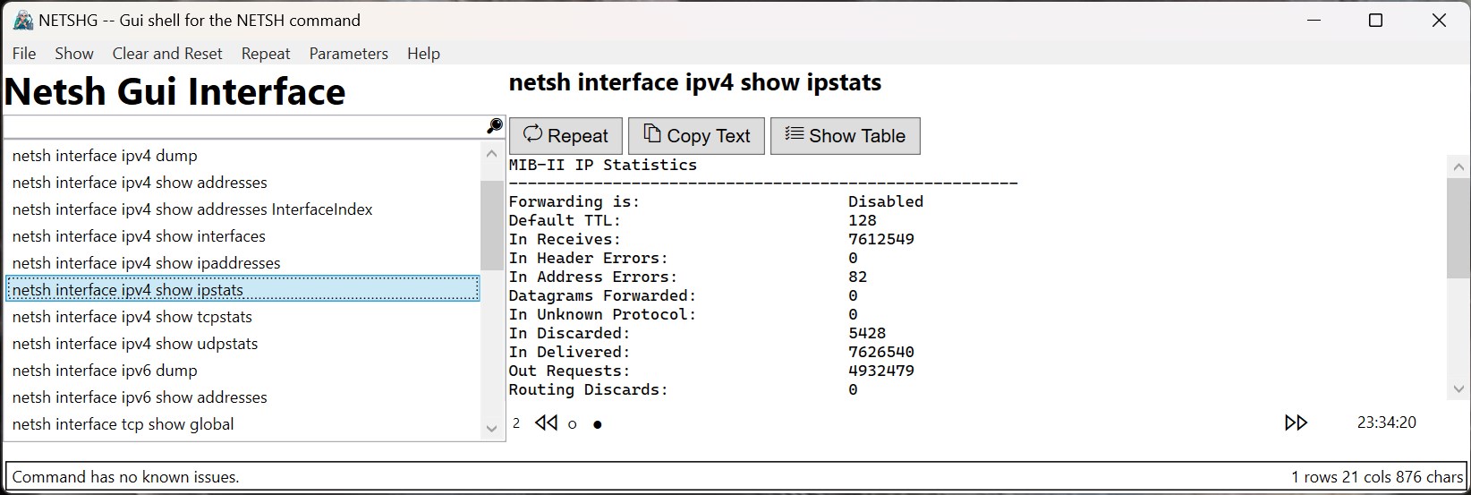 A simple graphical GUI shell over the NETSH command tools, NETSHG makes the process of running typical NETSH commands simple and intuitive. Parsers convert the text output to table form, allowing easy import into spreadsheets like Excel.