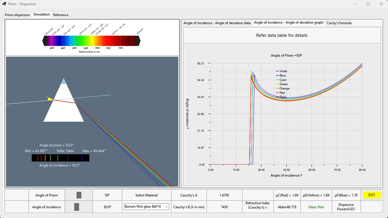 Prism dispersion is the process of separating white light into its component colors - red, orange, yellow, green, blue, and violet - upon passage through it. The prism achieves dispersion due to the difference in the refractive index according to the wavelength or different speeds with wavelength or frequency. The refractive index (μ) of a material depends upon wavelength (λ) and is given by Cauchy’s formula, μ = a+ b/(λ²). This application is an excellent demonstration of the above and a very useful tool for the academic community.