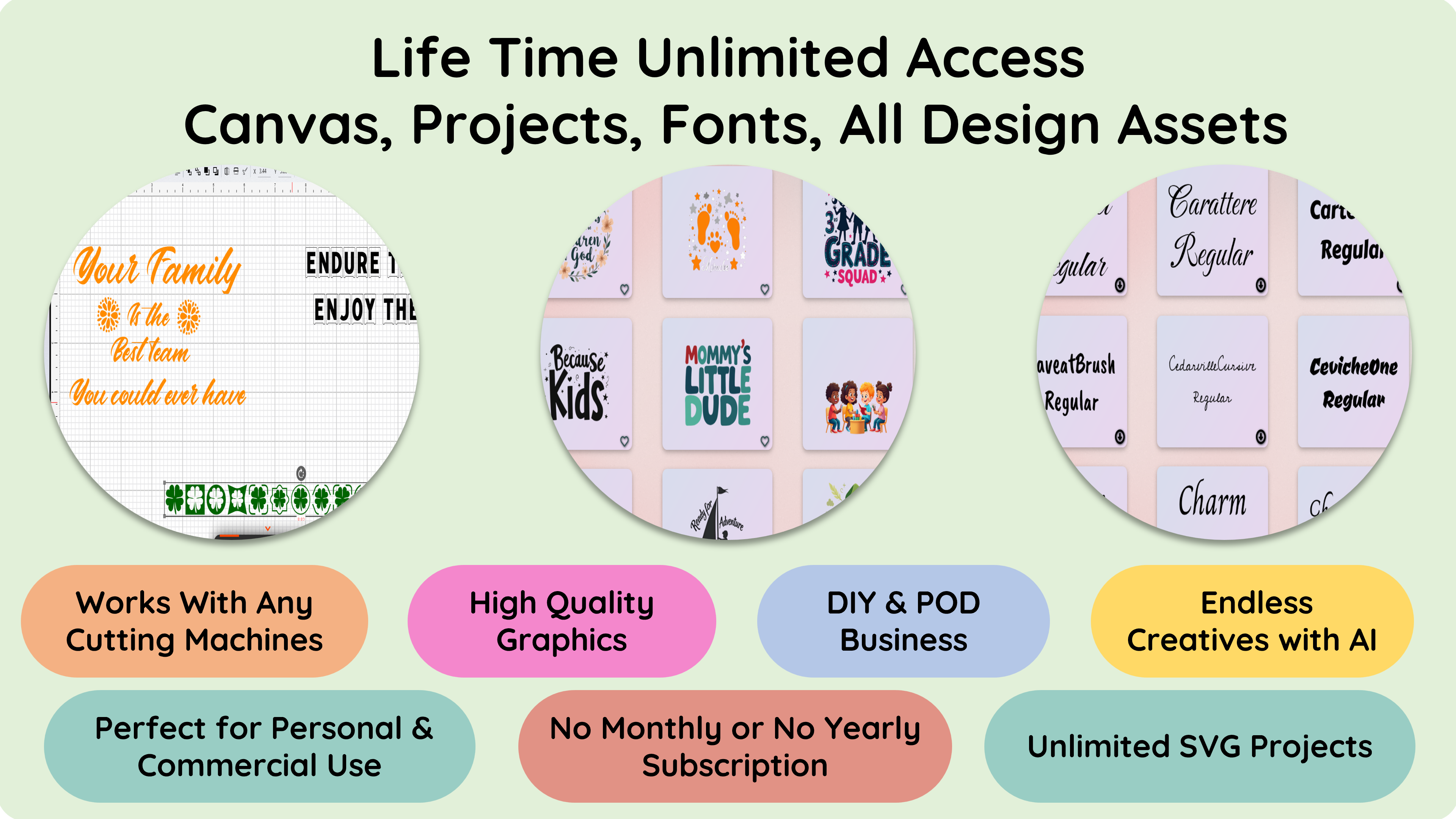 AI-powered design creation.Easy personalization and ordering process.Access to over 1,000 premium fonts.Unlimited Access to AI Generated Designs and SVG cutfiles.For printing or DIY making