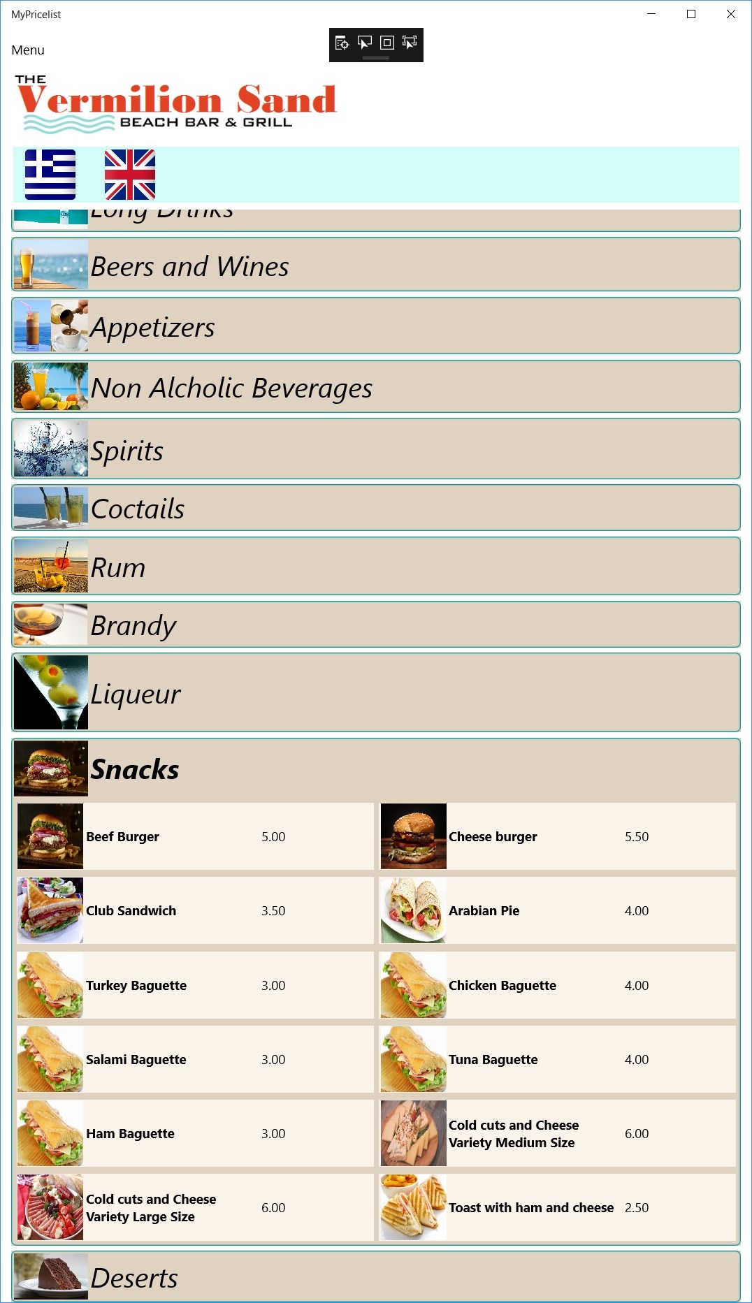 MyPricelist is used to display a pricelist at the entrance of a restaurant, café or bar on a large touch screen. It can also be used in the premises in order to display the pricelist on ta tablet. The price list can be multilingual and the user selects the language to display. The price list can use photos and descriptions of the menu items.