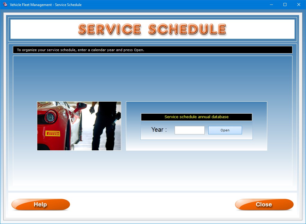 The Service Schedule app allows you to monitor deadlines regarding the vehicles to be overhauled or repaired and to be notified when the date arrives through the use of reports and reminders. The deadlines you can manage could concern ordinary or extraordinary maintenance interventions on vehicles, payment of vehicle taxes, trips and any appointment concerning each vehicle in your car fleet. To use this app you need to create a new annual database of scheduled services or open an annual database that you have already created. So, the first operation you need to perform is to select the calendar year of interest and press the Open button.