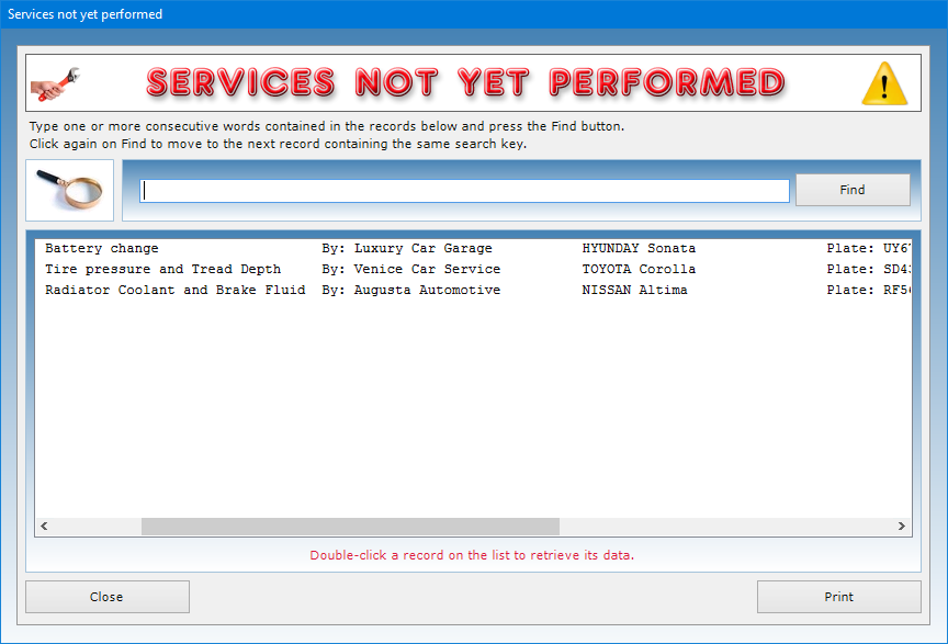 The software allows you to carry out advanced searches in the database even using a partial search key, that is, indicating one or more consecutive words contained in any text field. For each search you can refer to one or more fields at the same time. For example, you can obtain a list of all the cars on which a specific service will have to be carried out during the year, or a list of all the services performed on a specific car.