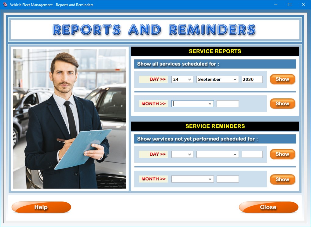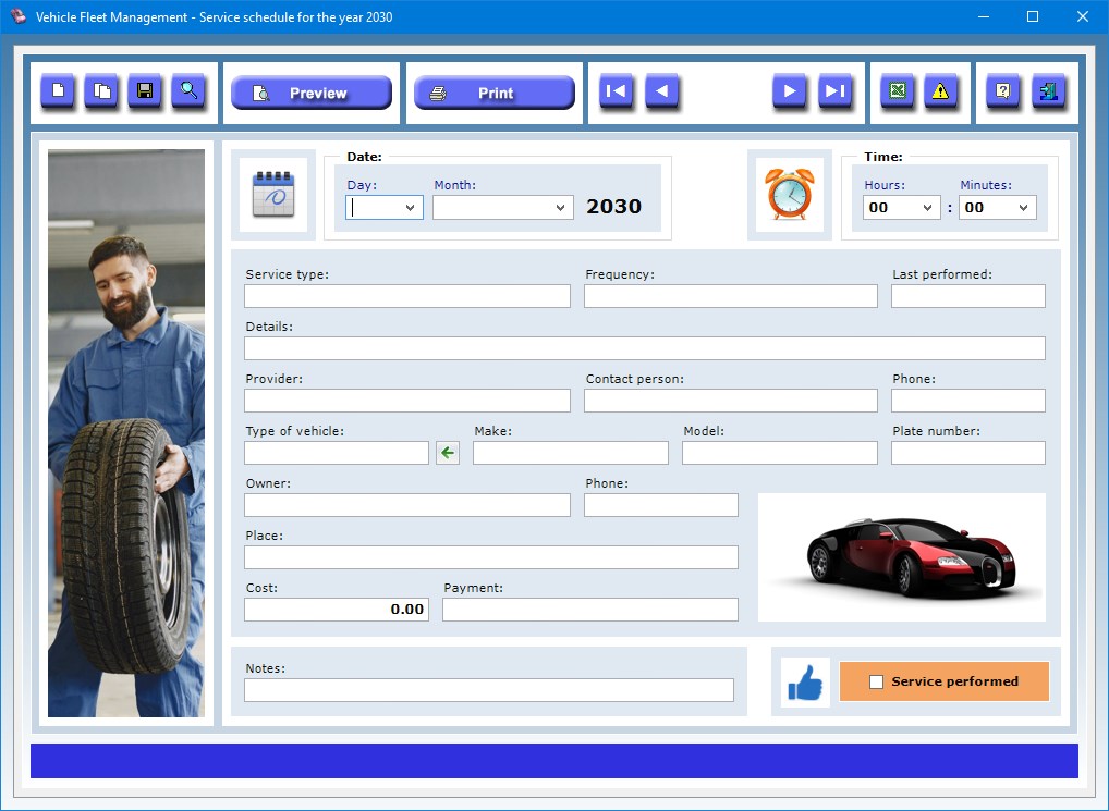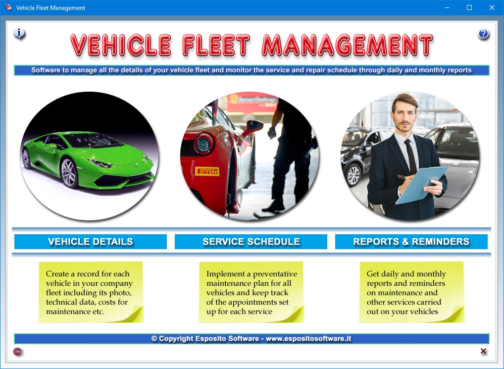 Vehicle Fleet Management is very user-friendly software that makes it easy for you and your company to keep under control all the needs of your cars, vans, trucks and other vehicles of your fleet and monitor the maintenance schedule through daily and monthly reports and reminders. The program is composed of three interacting apps that allow you to keep track of vehicle information, implement a preventative maintenance plan and get detailed reports on all of the services carried out on each vehicle. The vehicle record can be enriched with a photo whose preview is always visible in the description window.