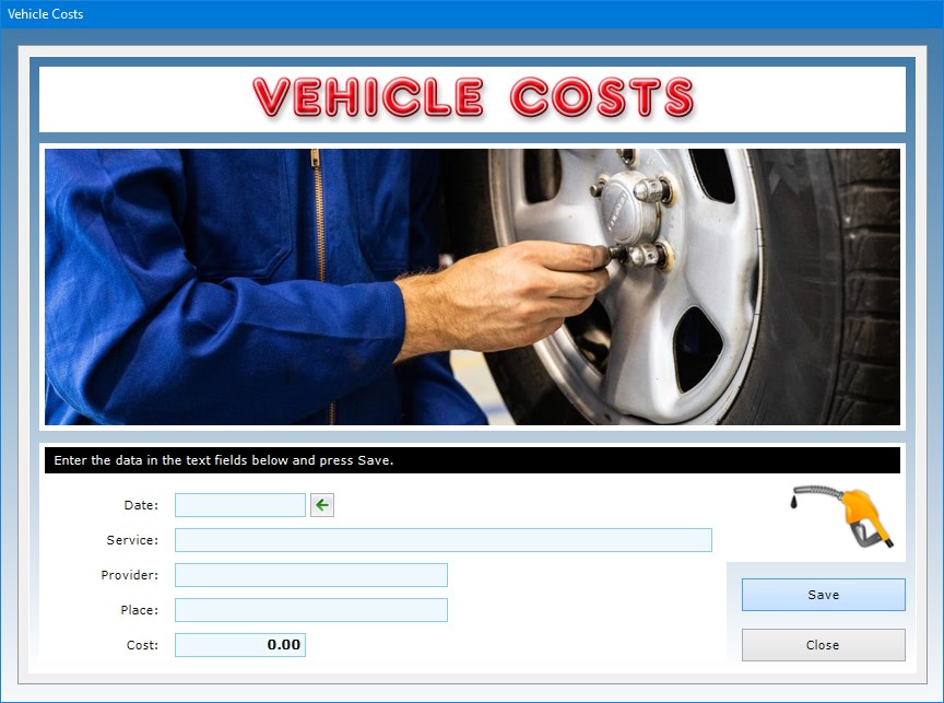 After saving the record, pressing the Vehicle Costs button gives you access to a window where you can list and print all of the costs incurred for the vehicle. To add a cost to the list, just press the Add cost button, fill in the text fields in the window that appears, press Save and then Close. For each cost you must indicate the date, the type of service (e.g. maintenance, repair, refueling etc.), the service provider (e.g. garage, auto electrical workshop, gas station etc.), the place where the service was provided, and the amount paid.