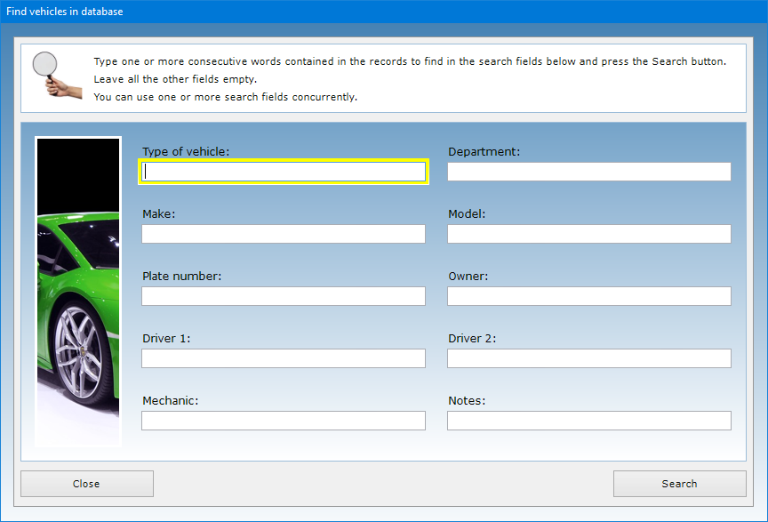 The software allows you to carry out advanced searches in the database even using a partial search key, that is, indicating one or more consecutive words contained in any text field. For each search you can refer to one or more fields at the same time. For example, you can obtain a list of all the vehicles belonging to the same owner or those assigned to a specific department of your company.