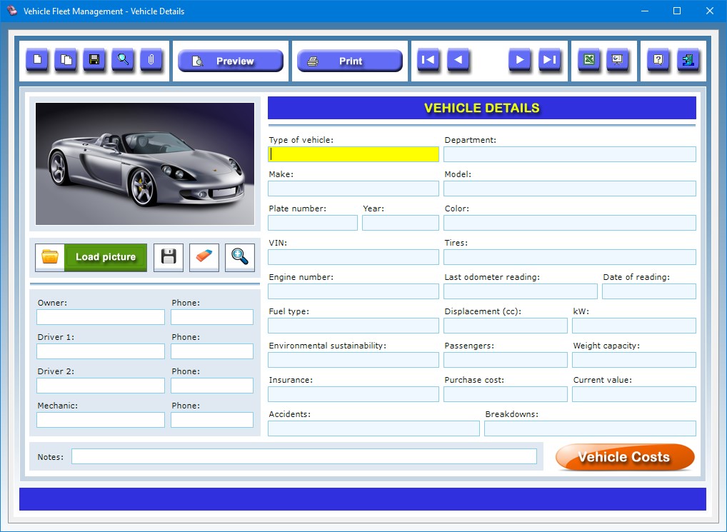 But the information you can record does not end there, as you can also add your last odometer reading and the day it was taken, the department in your company which the vehicle is assigned to, the name and phone number of the owner of the vehicle, the first and second driver and the mechanic who normally takes care of the vehicle in your trusted garage.