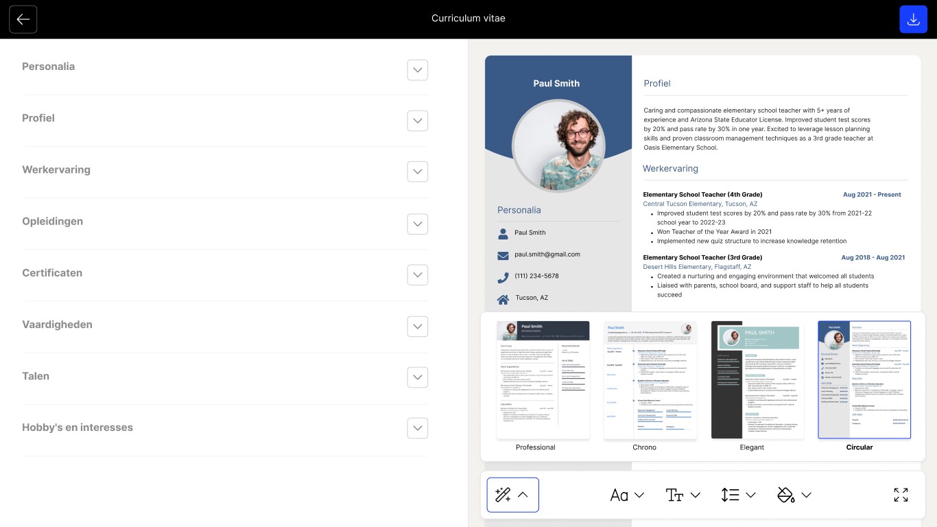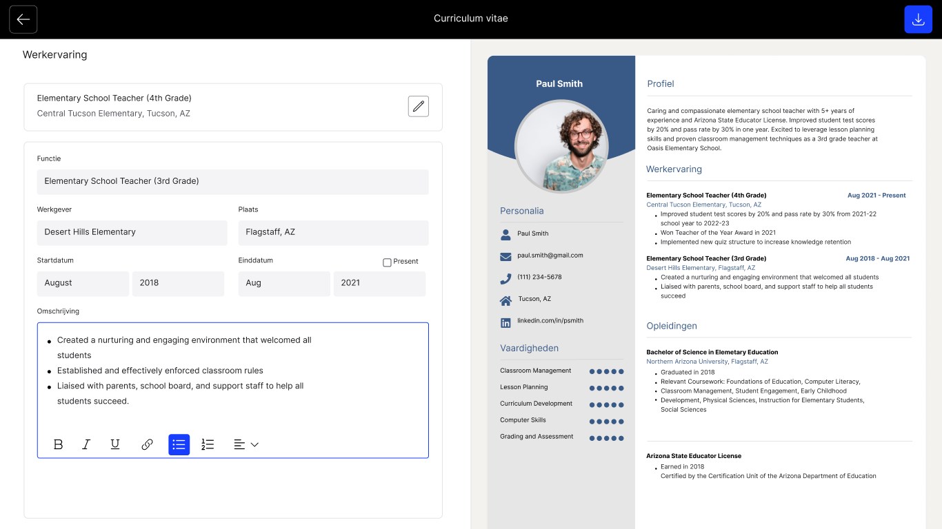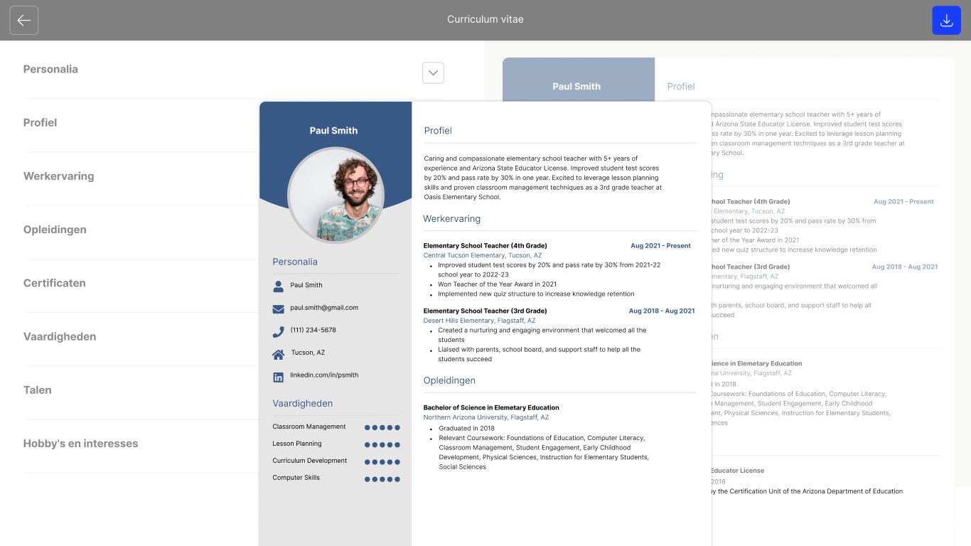 3. CV downloaden: Daarna kun je jouw opgestelde CV direct downloaden en eenvoudig achteraf bewerken.
