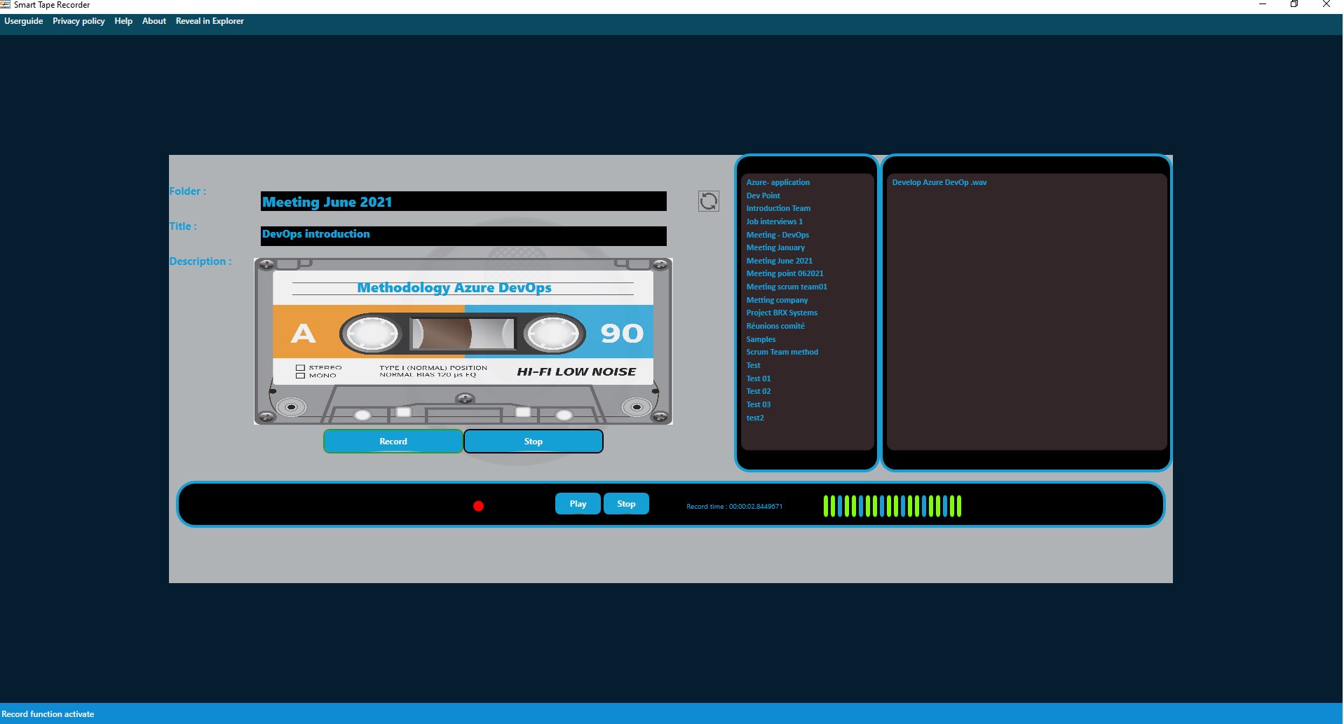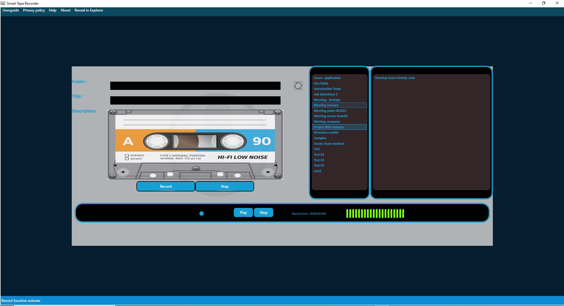 This application will allow you to use your computer or any other Microsoft hardware as a tape recorder through your microphone with a retro look.
