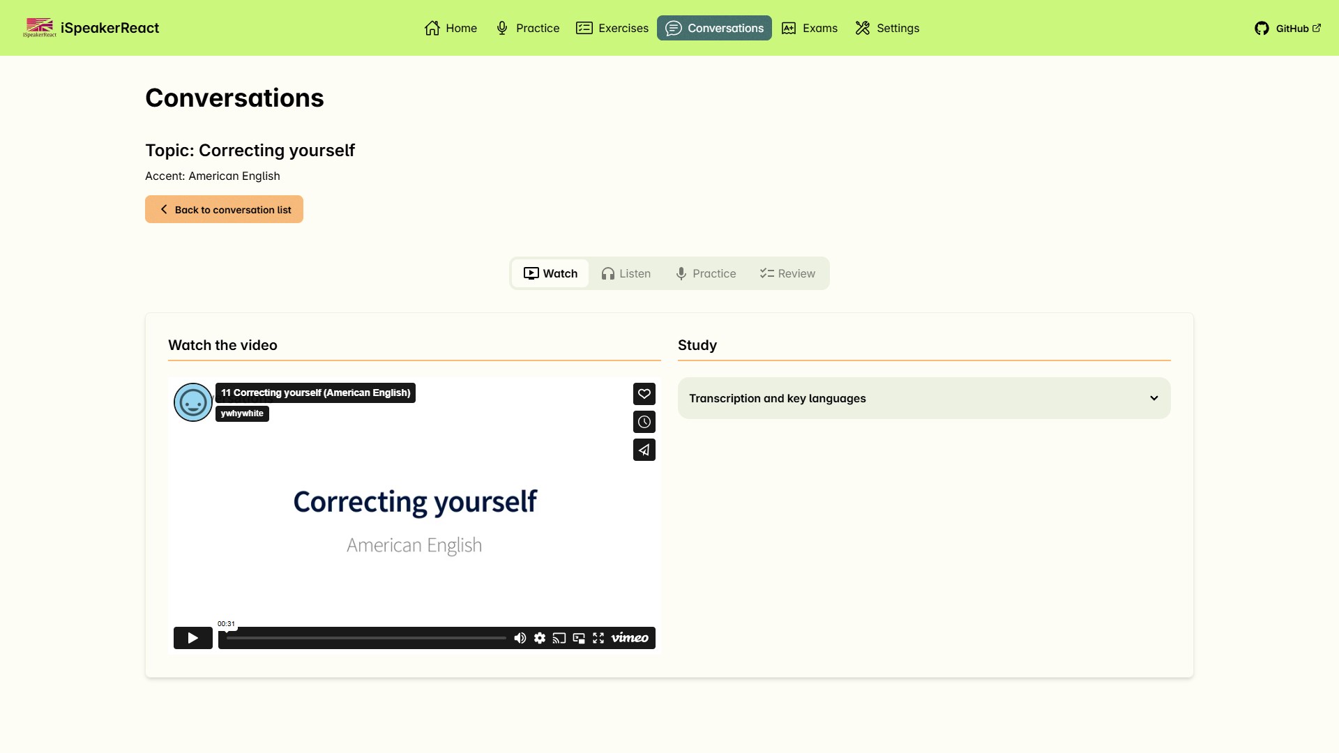 Rewritten from the ground up, iSpeakerReact is a self-study interactive tool designed to help learners improve their speaking and listening skills. Whether you're aiming to refine your English pronunciation, sharpen your listening abilities, or enhance your overall speaking skills, iSpeakerReact provides guidance at every stage. Master everyday conversations, perfect your pronunciation, and prepare for various speaking exams with ease.