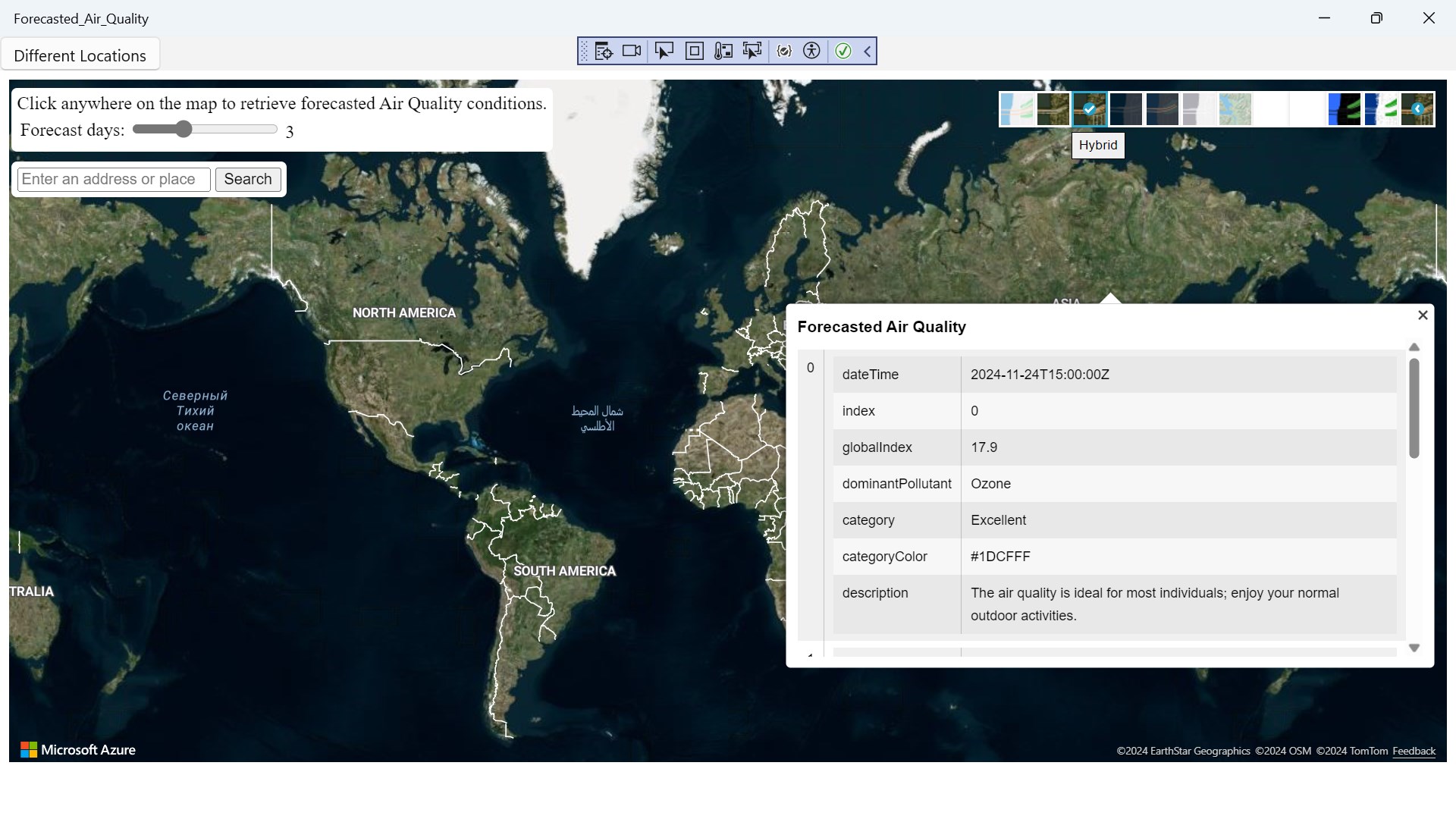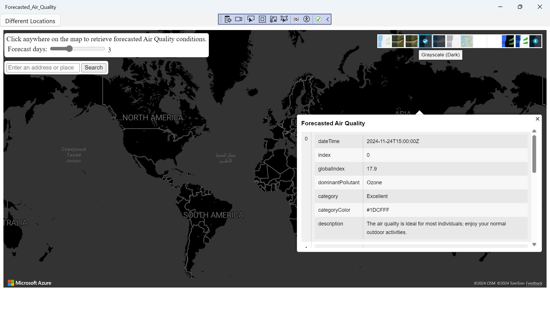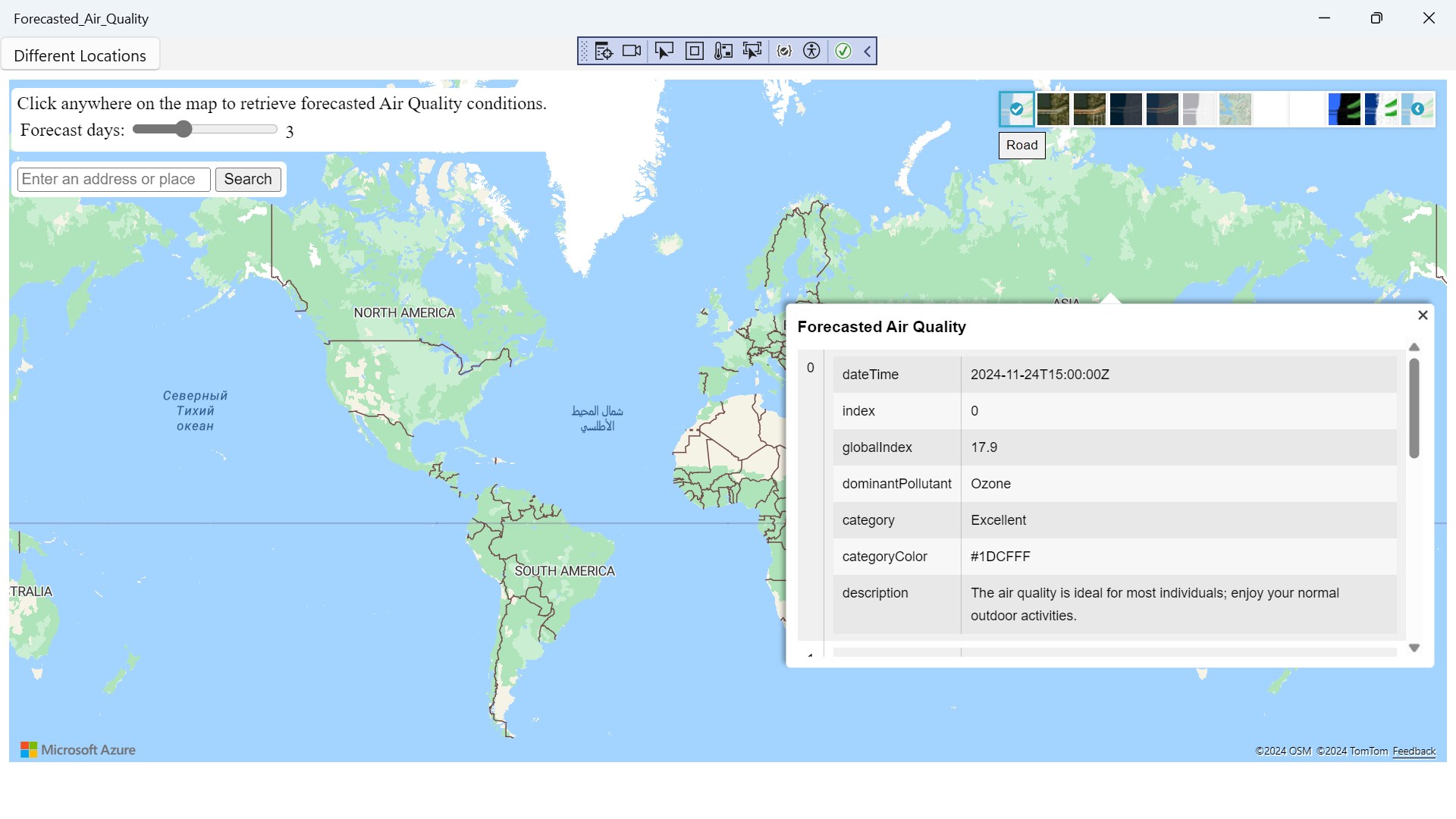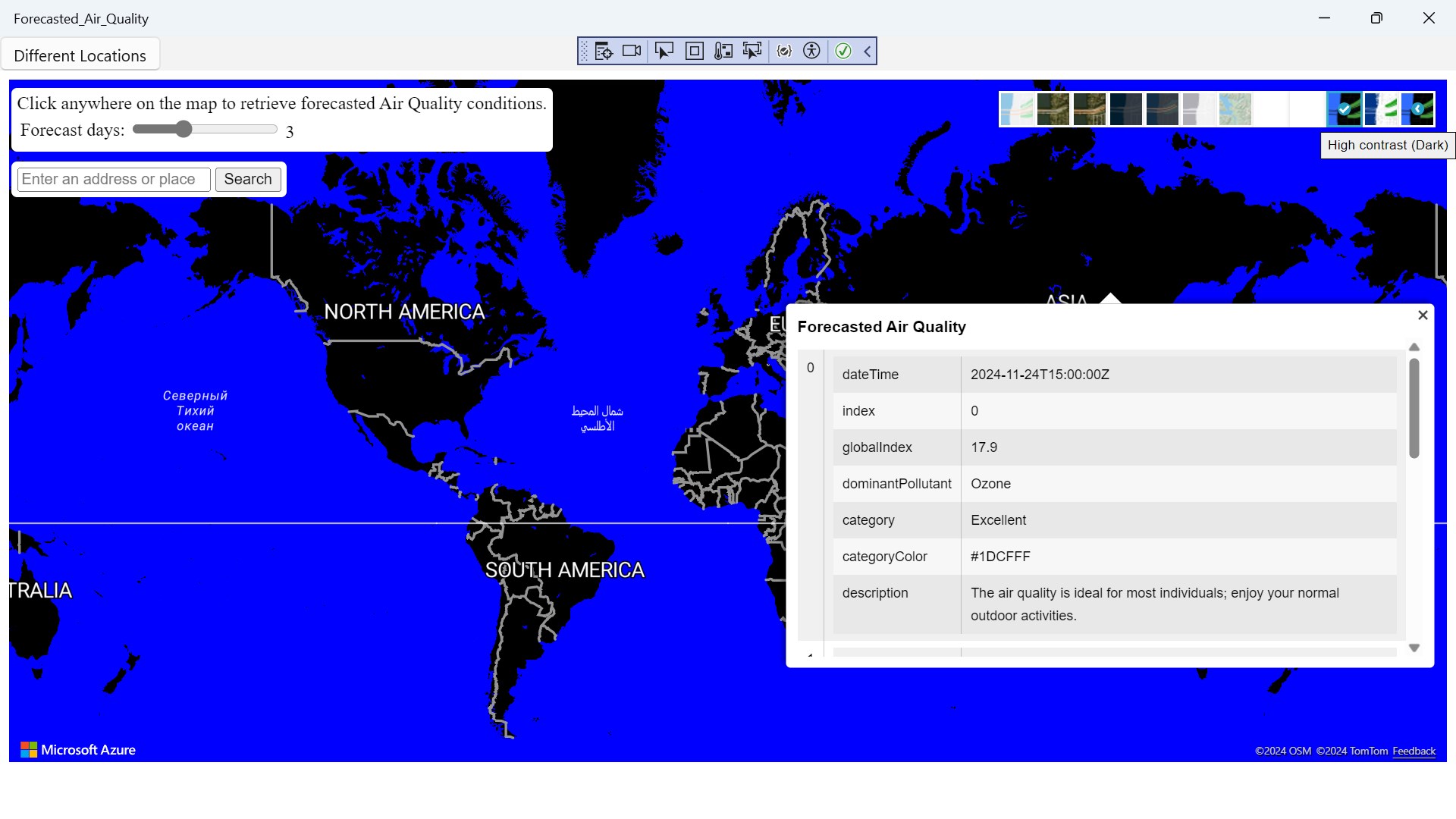 Forecasted Air Quality is a app where you can search anywhere in the world to check the Forecasted Air Quality left click on mouse to get a reading result to check weather.