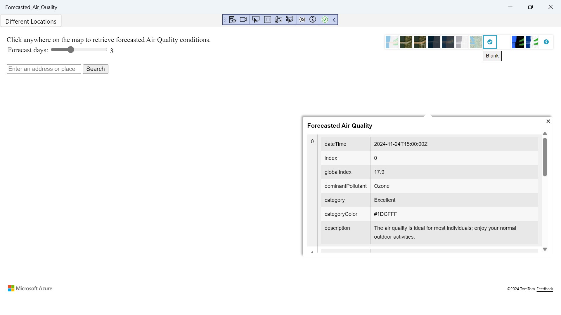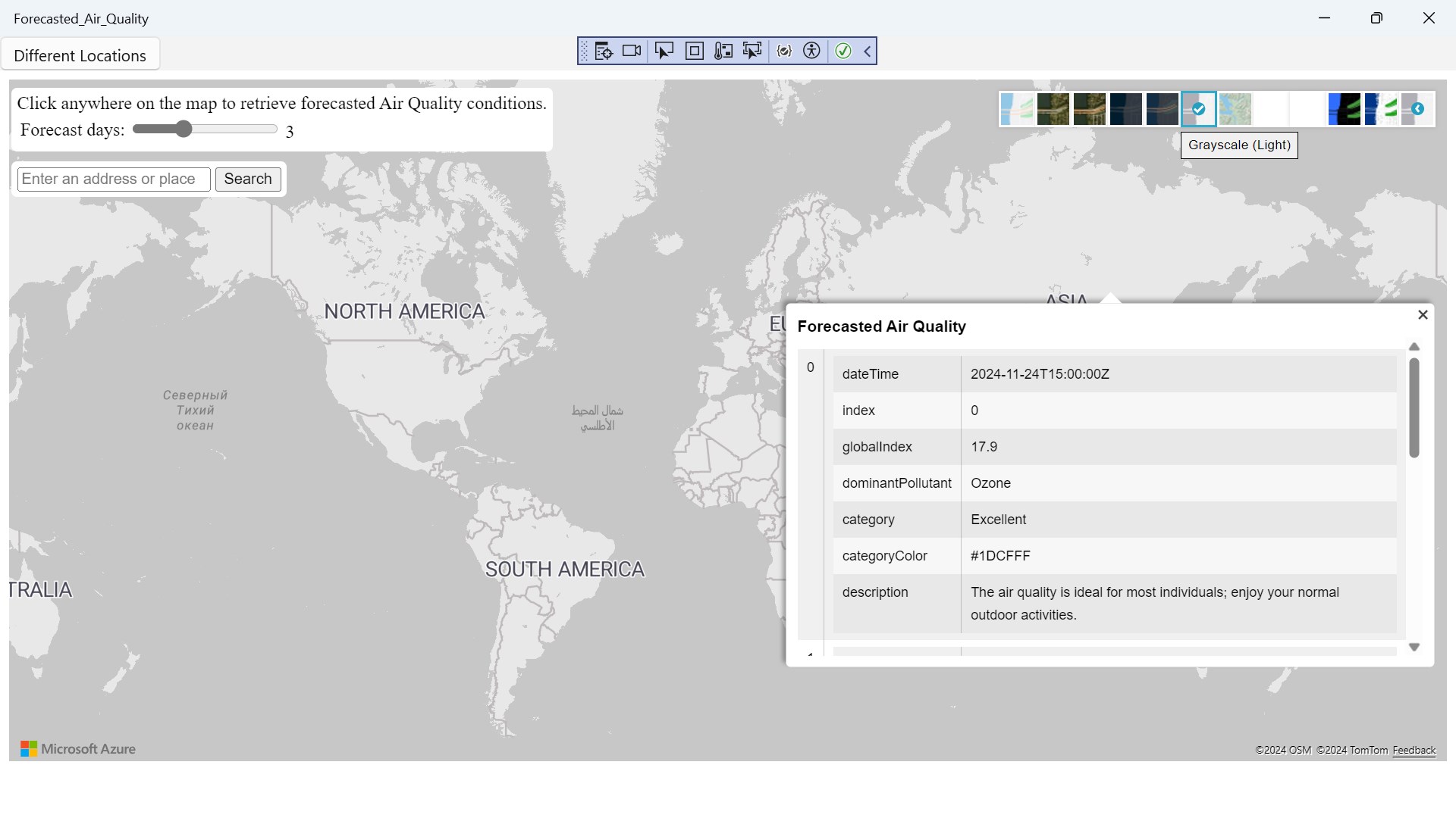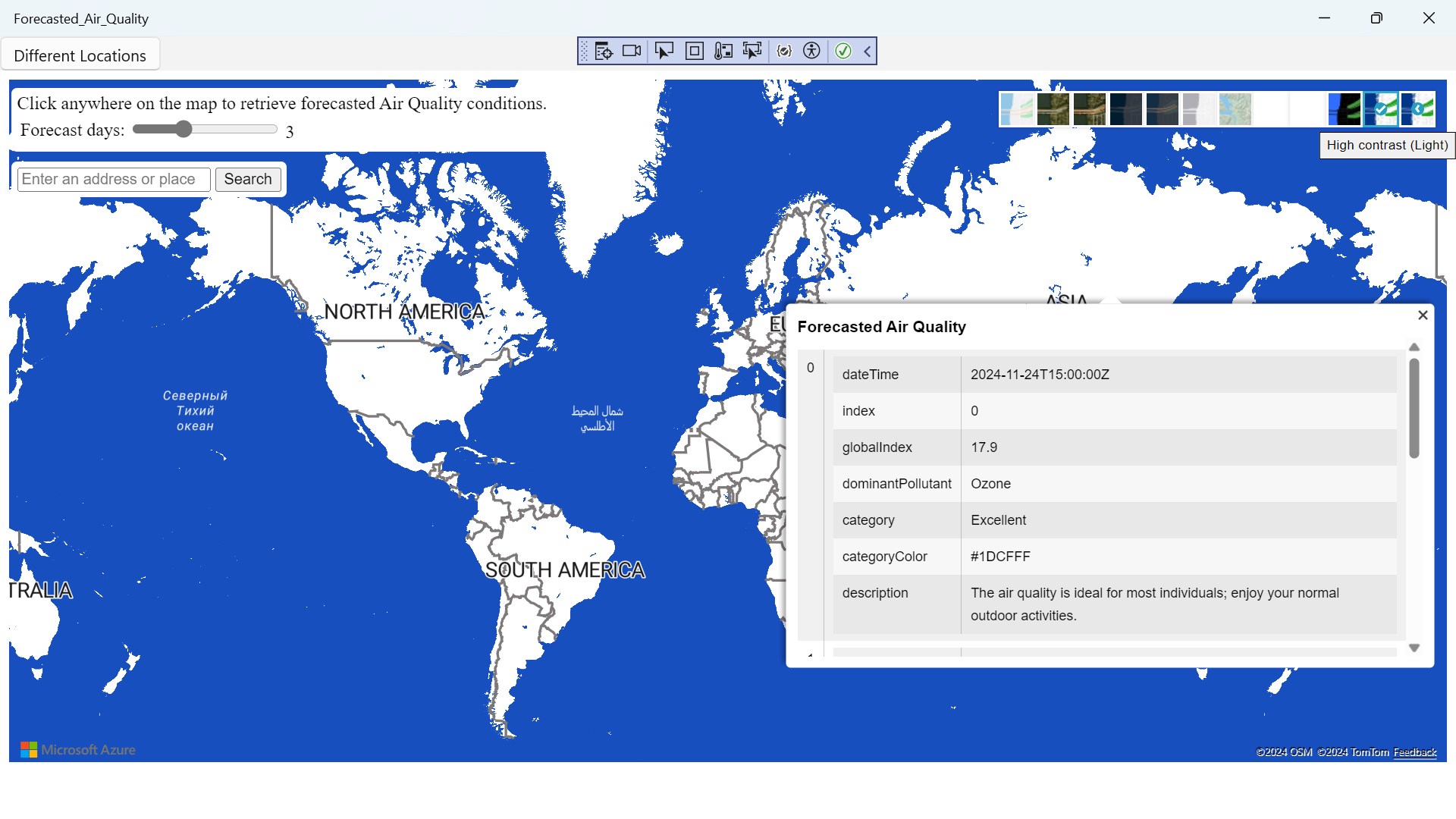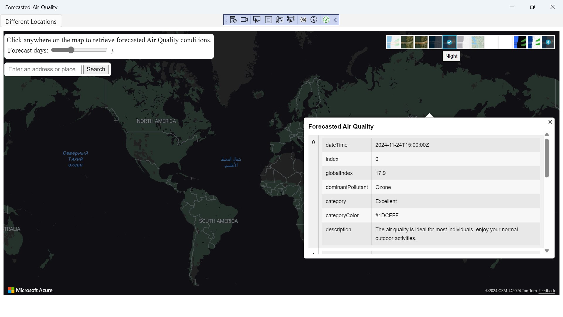 Forecasted Air Quality is a app where you can search anywhere in the world to check the Forecasted Air Quality left click on mouse to get a reading result to check weather.